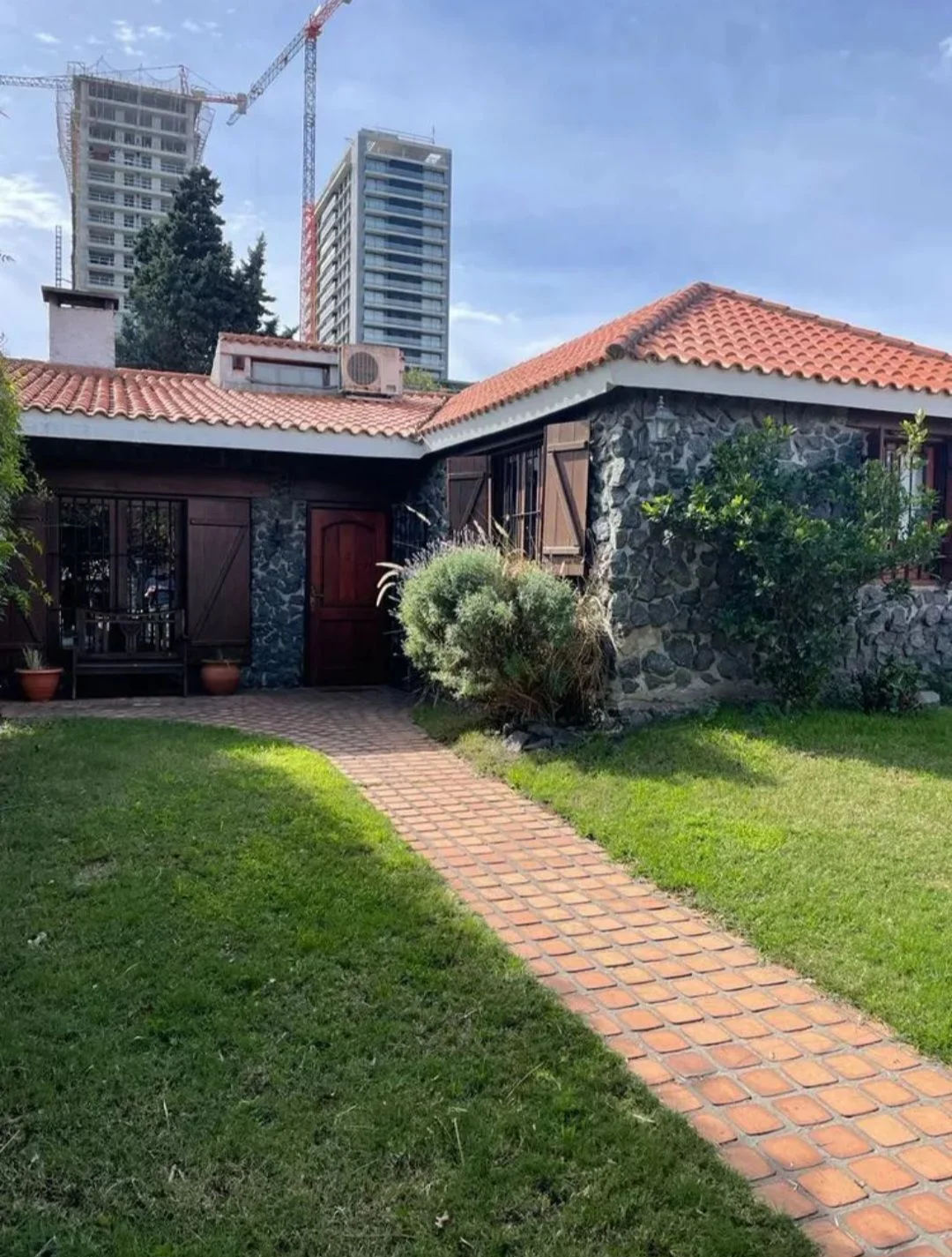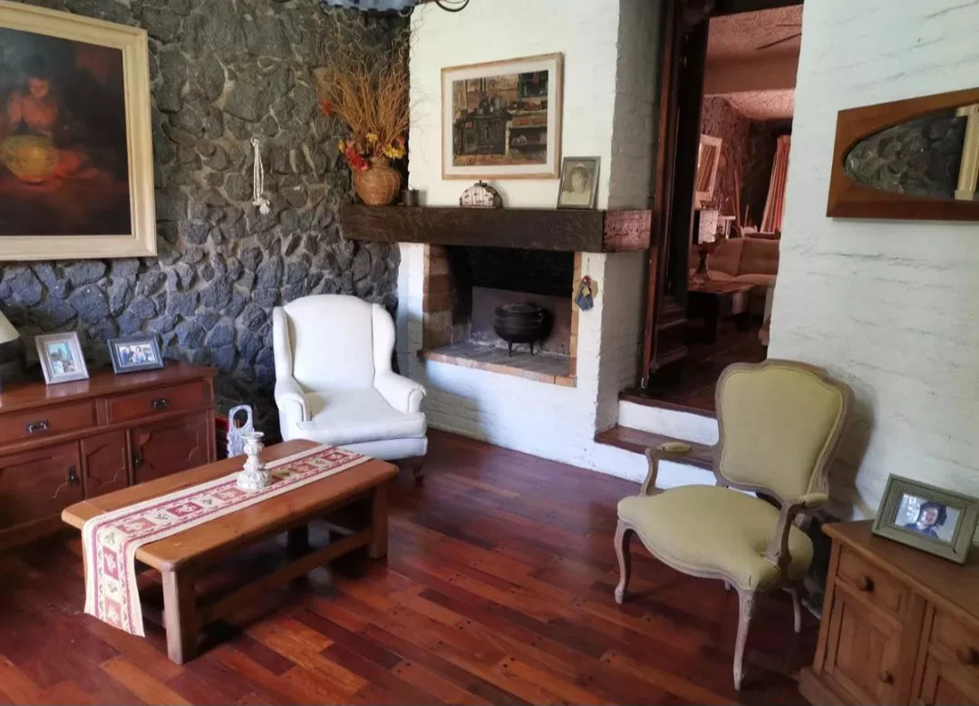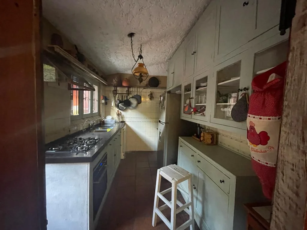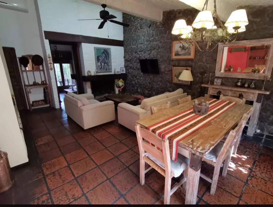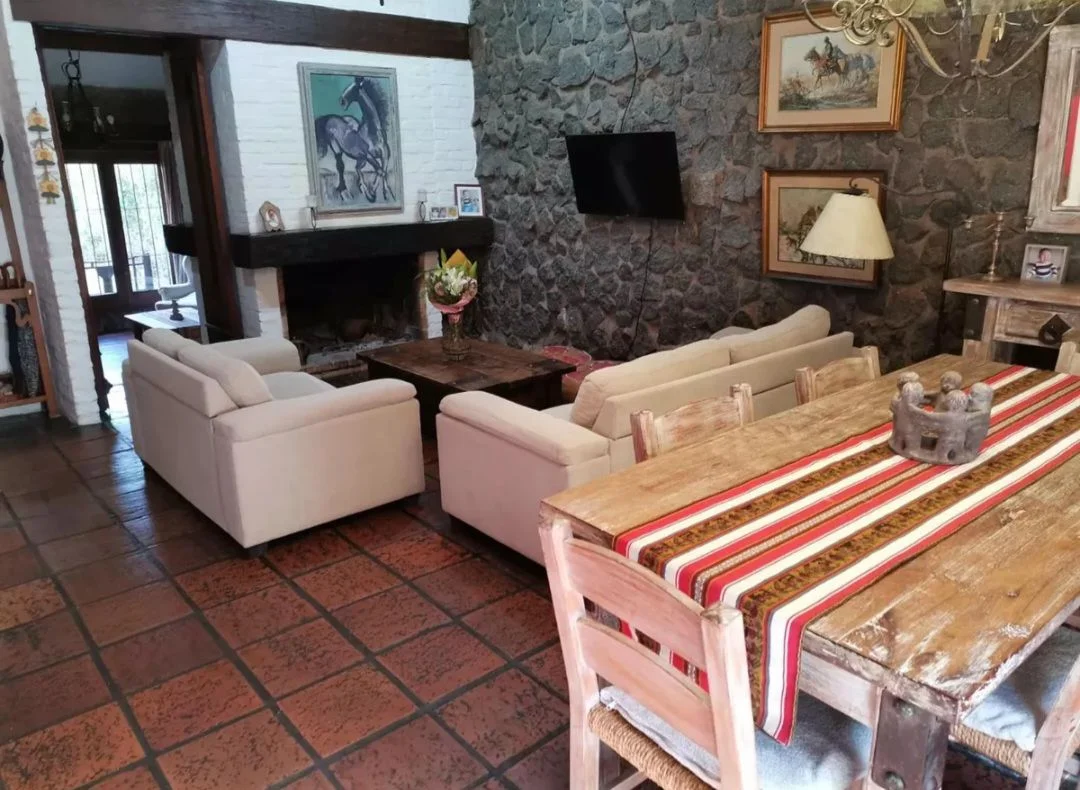 La propiedad posee un frente con jardín, acceso peatonal y vehicular, disponiendo de cochera cerrada. En su interior, el living cuenta con estufa a leña y buena iluminación natural, conectado a un estar-comedor equipado con otra estufa a leña. La casa principal tiene tres dormitorios ventilados e iluminados, un baño social y otro baño completo con mampara de vidrio. Sigue una cocina equipada con anafe, horno empotrado y múltiples placares.