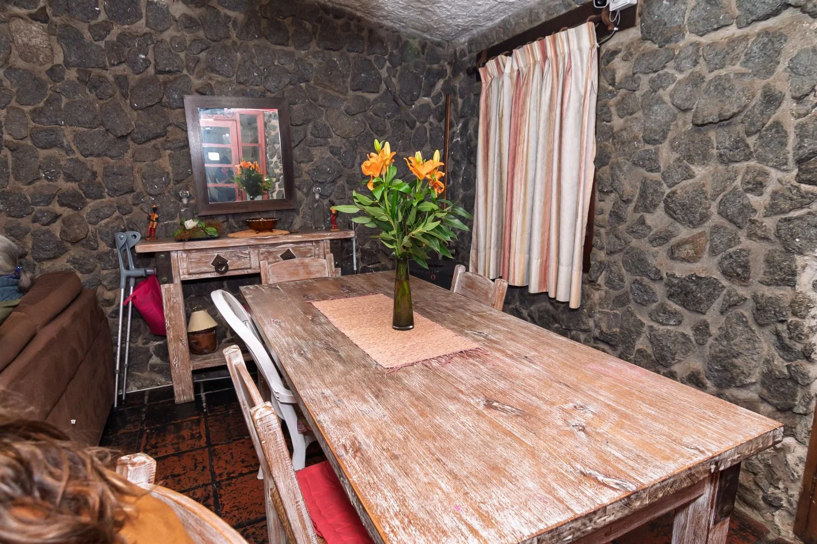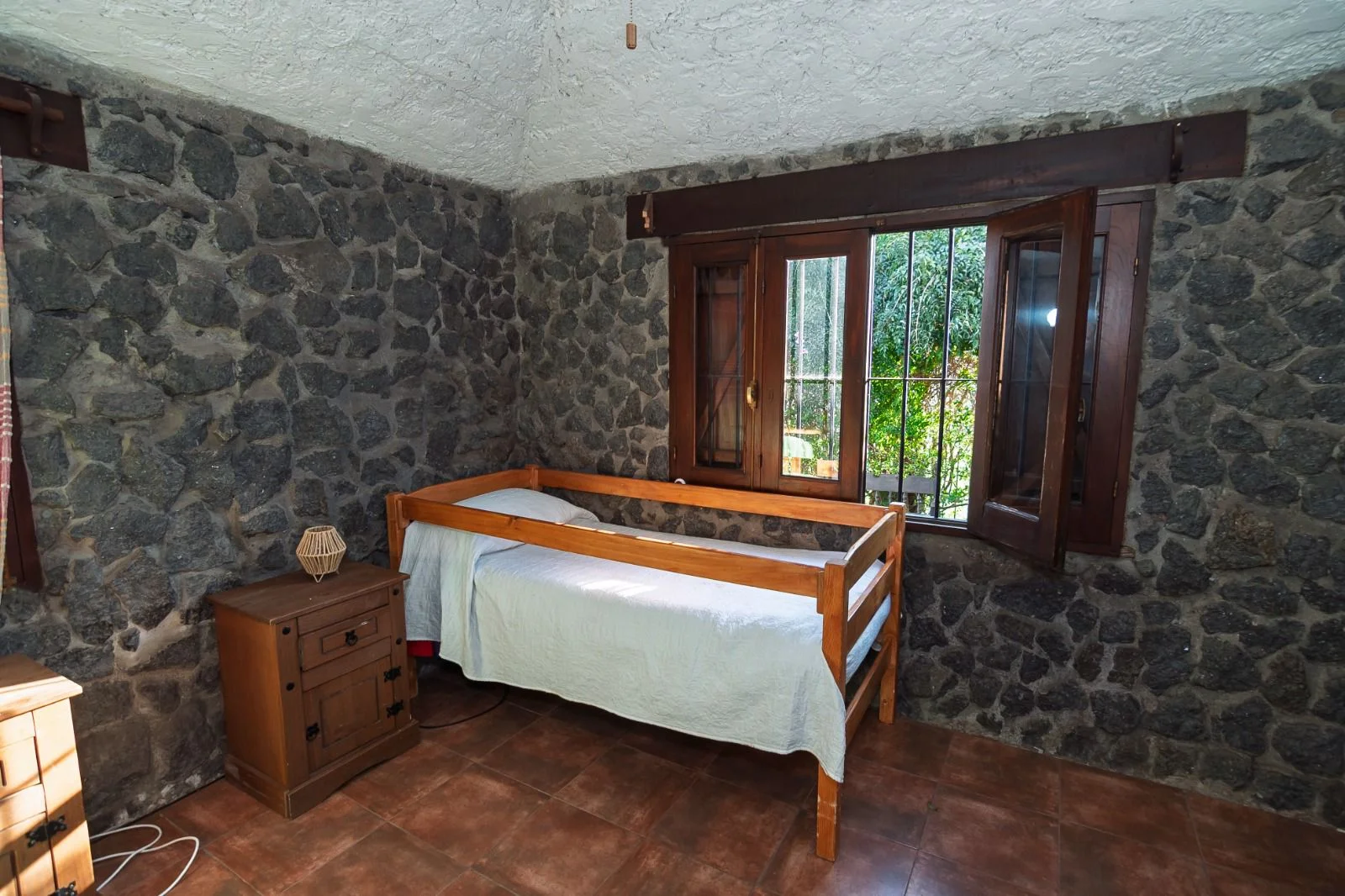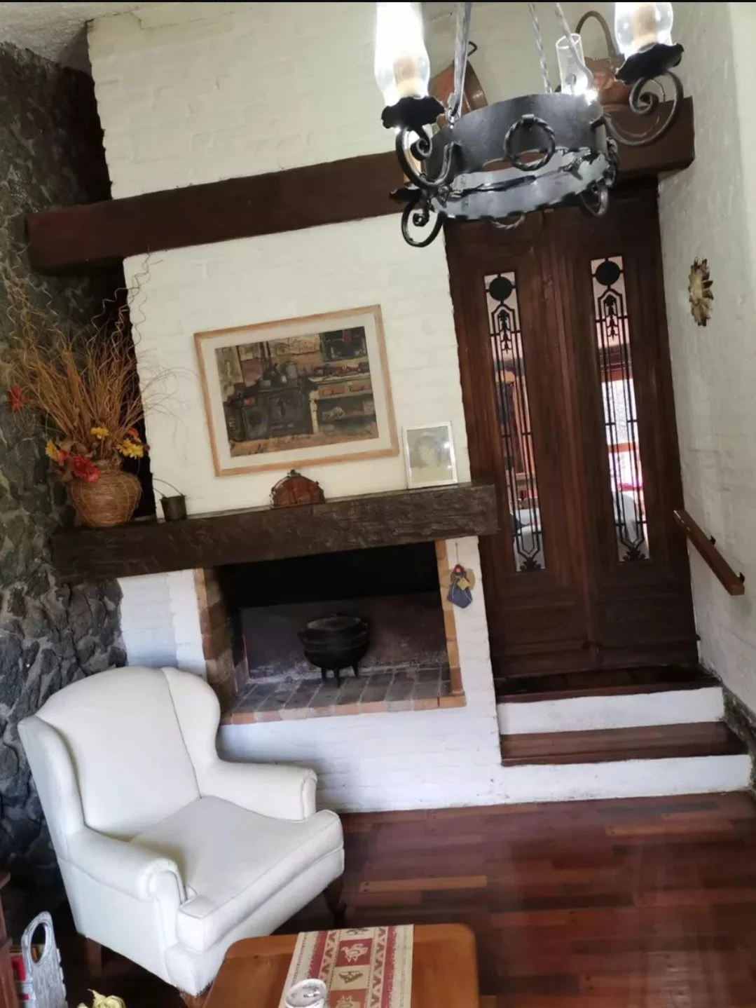 La propiedad posee un frente con jardín, acceso peatonal y vehicular, disponiendo de cochera cerrada. En su interior, el living cuenta con estufa a leña y buena iluminación natural, conectado a un estar-comedor equipado con otra estufa a leña. La casa principal tiene tres dormitorios ventilados e iluminados, un baño social y otro baño completo con mampara de vidrio. Sigue una cocina equipada con anafe, horno empotrado y múltiples placares.