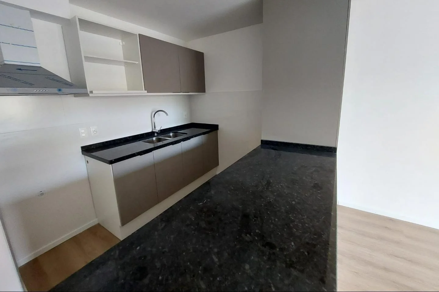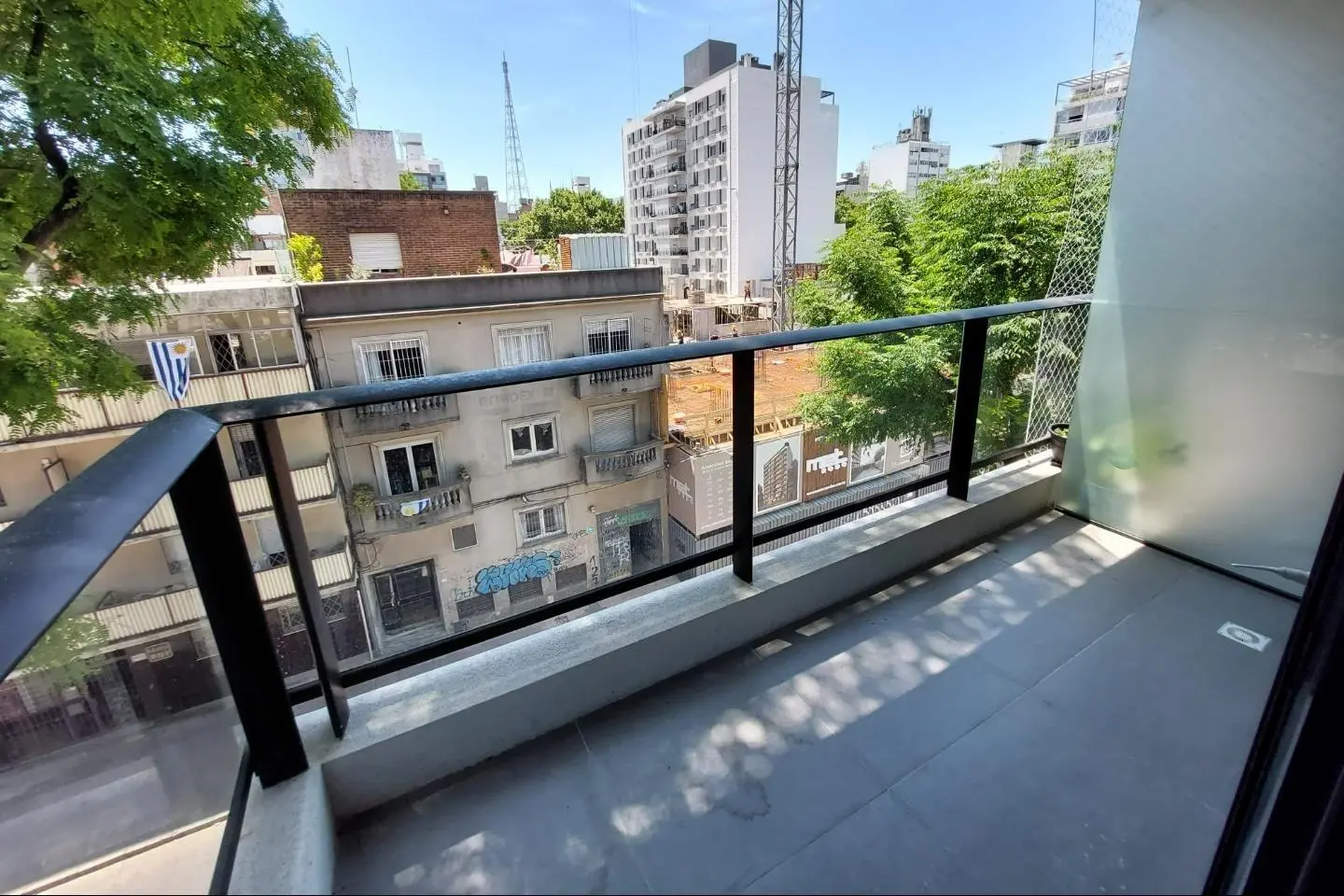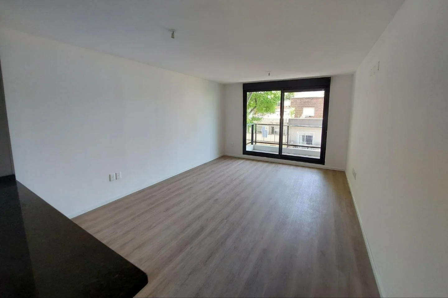 Amplio living-comedor de más de 3,5m de ancho por casi 6m de largo, terraza al frente, cocina integrada con barra y placares sobre y bajo mesada.