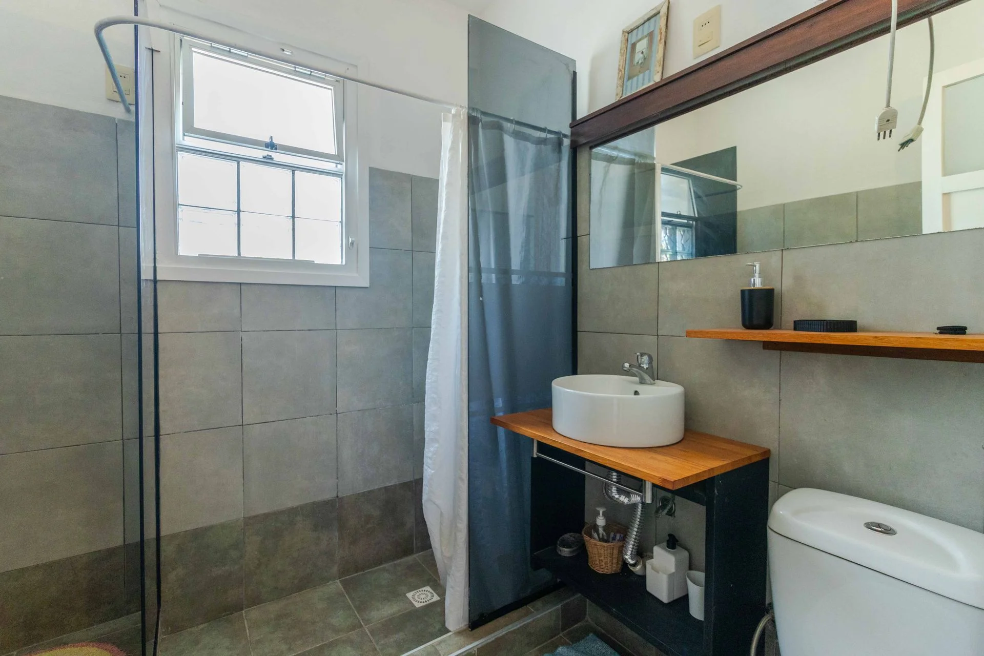 Bano con ducha y conexion al lavarropa. Amplio dormitorio con pisos de madera.