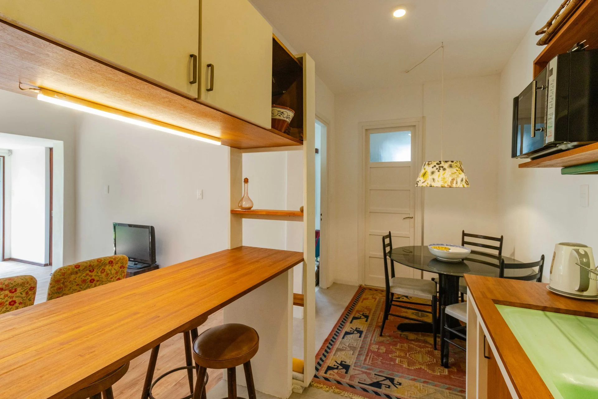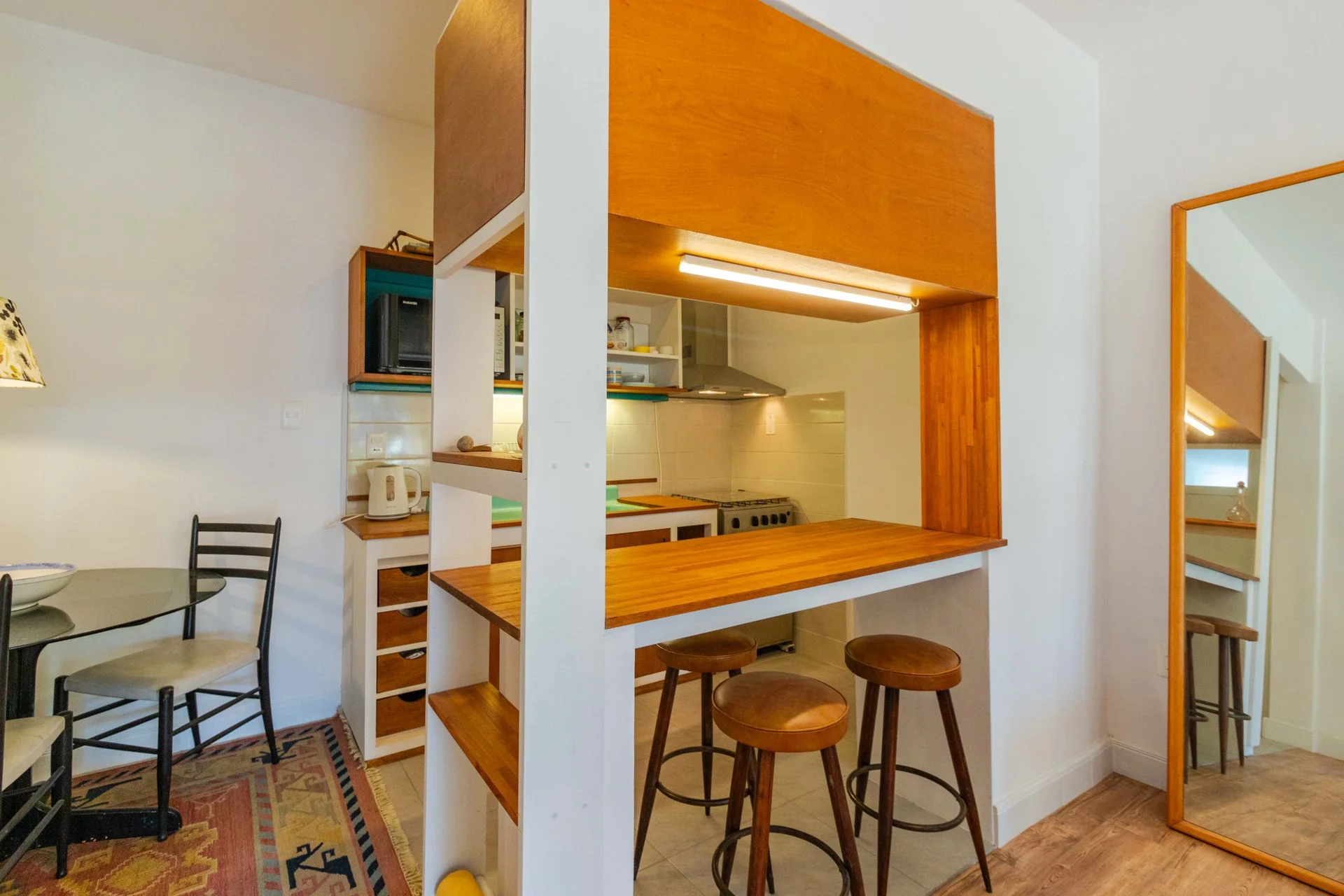 Al ingresar tenemos una recepcion con escritorio y 1 dormitorio al frente con entrada independiente. Luego tenemos el living y la cocina semi integrada con barra seguida del comedor.