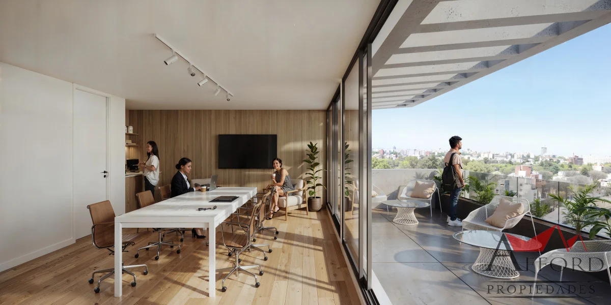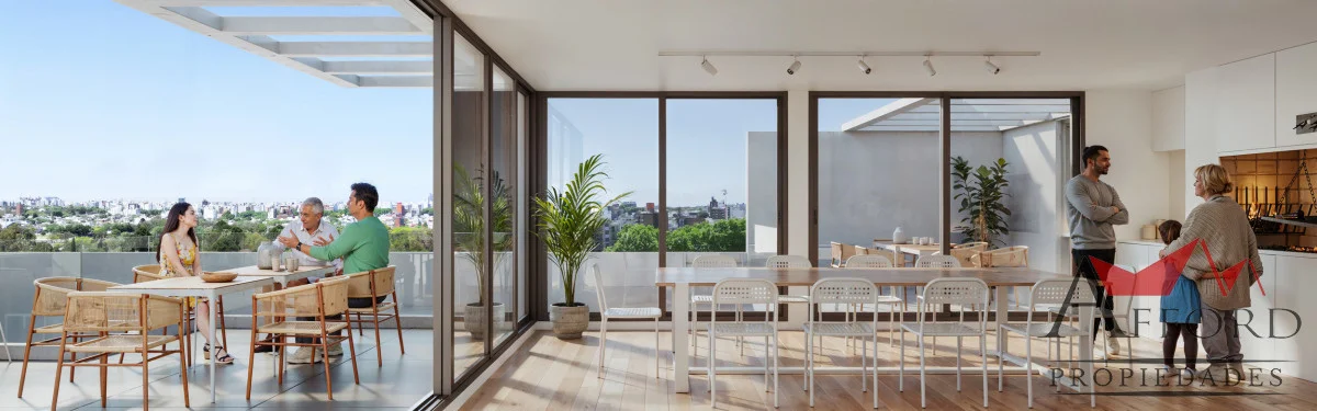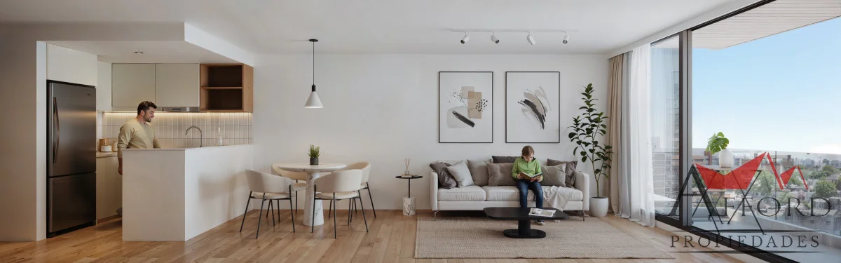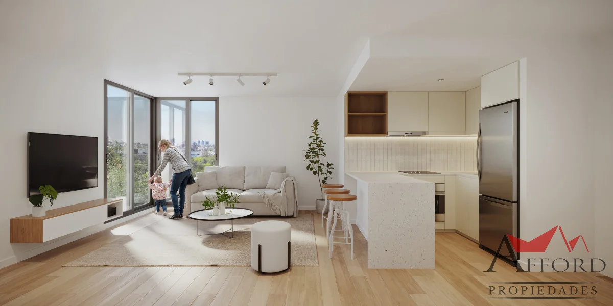 Living comedor, con cocina integrada, con placares sobre y bajo mesada. Acceso desde el living comedor al patio de 38 m2 de uso exclusivo de la unidad. Un dormitorio al contrafrente, con vista hacia el patio y el segundo dormitorio al frente, con terraza. Un baño completo.