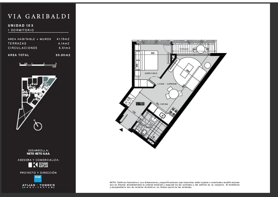 Primer piso al frente con orientación norte, cómodo dormitorio, living comedor con cocina integrada, práctica salida al balcón desde el living y el dormitorio.