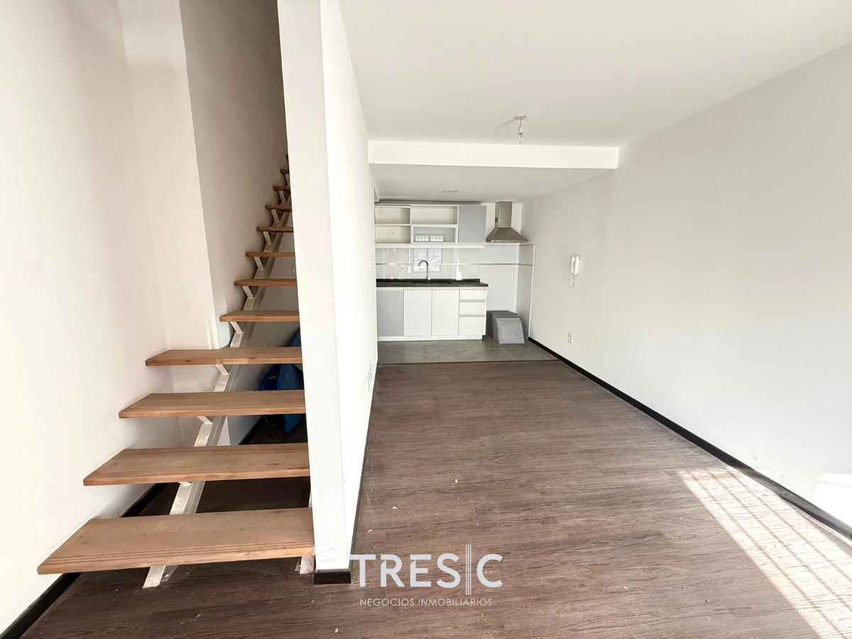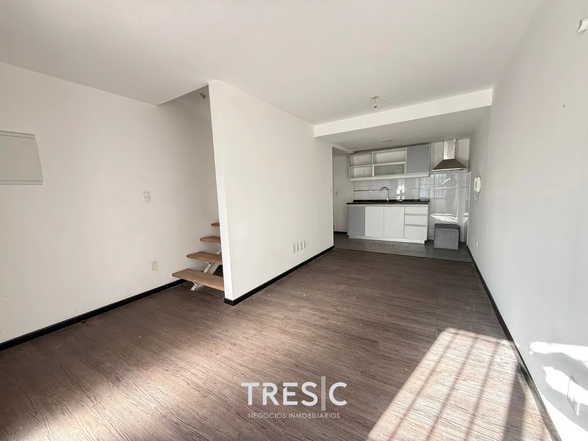 La cocina integrada presenta placares aéreos y bajo mesada, mesada de granito negro y campana extractora, además de un práctico espacio debajo de la escalera ideal para almacenamiento.