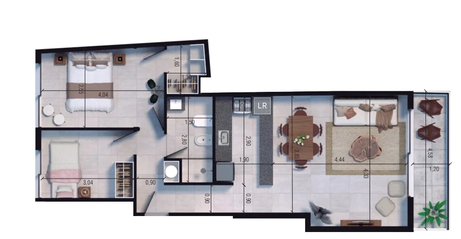 Living comedor con cocina semi integrada mediante barra.