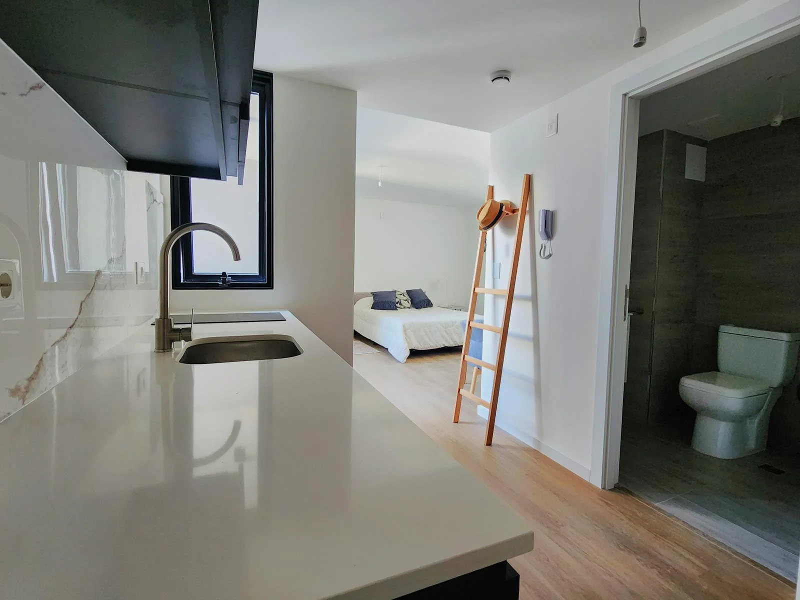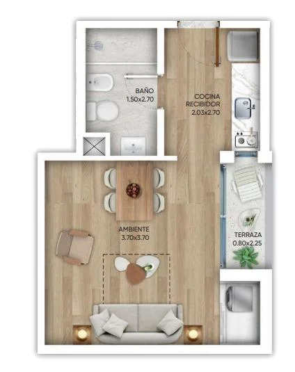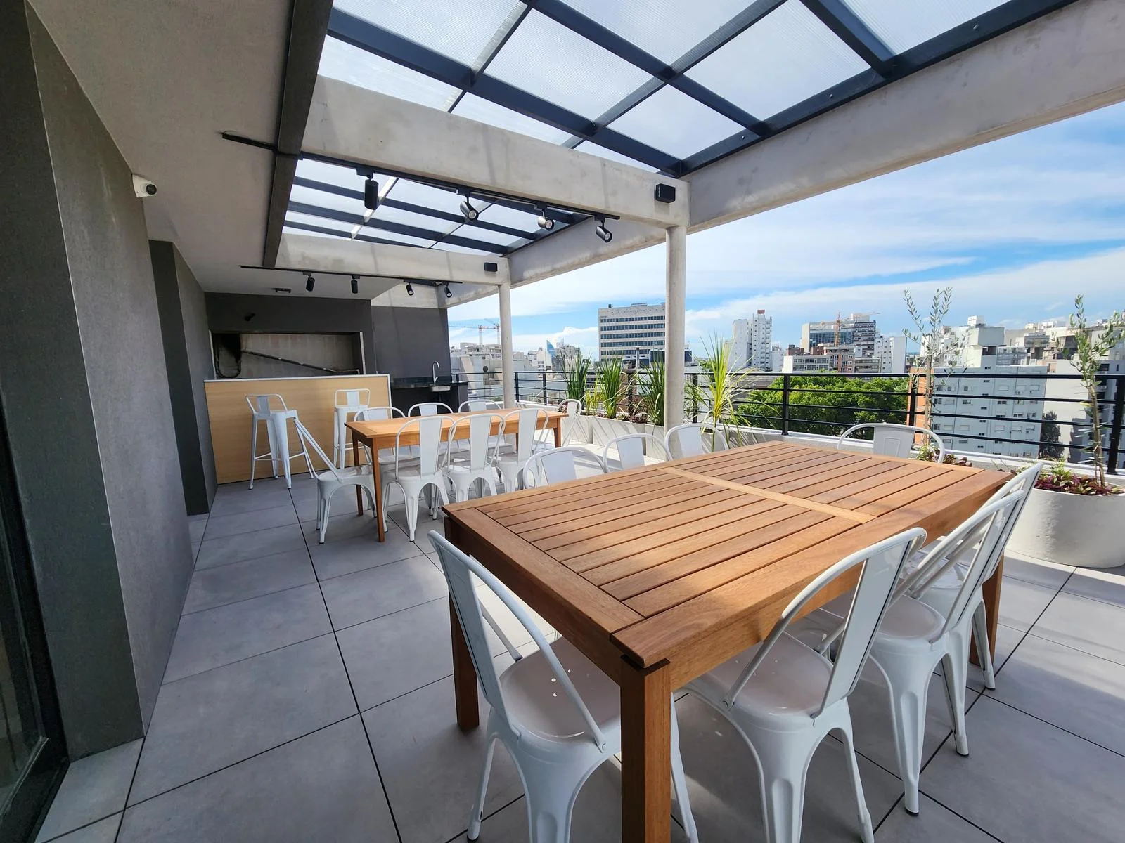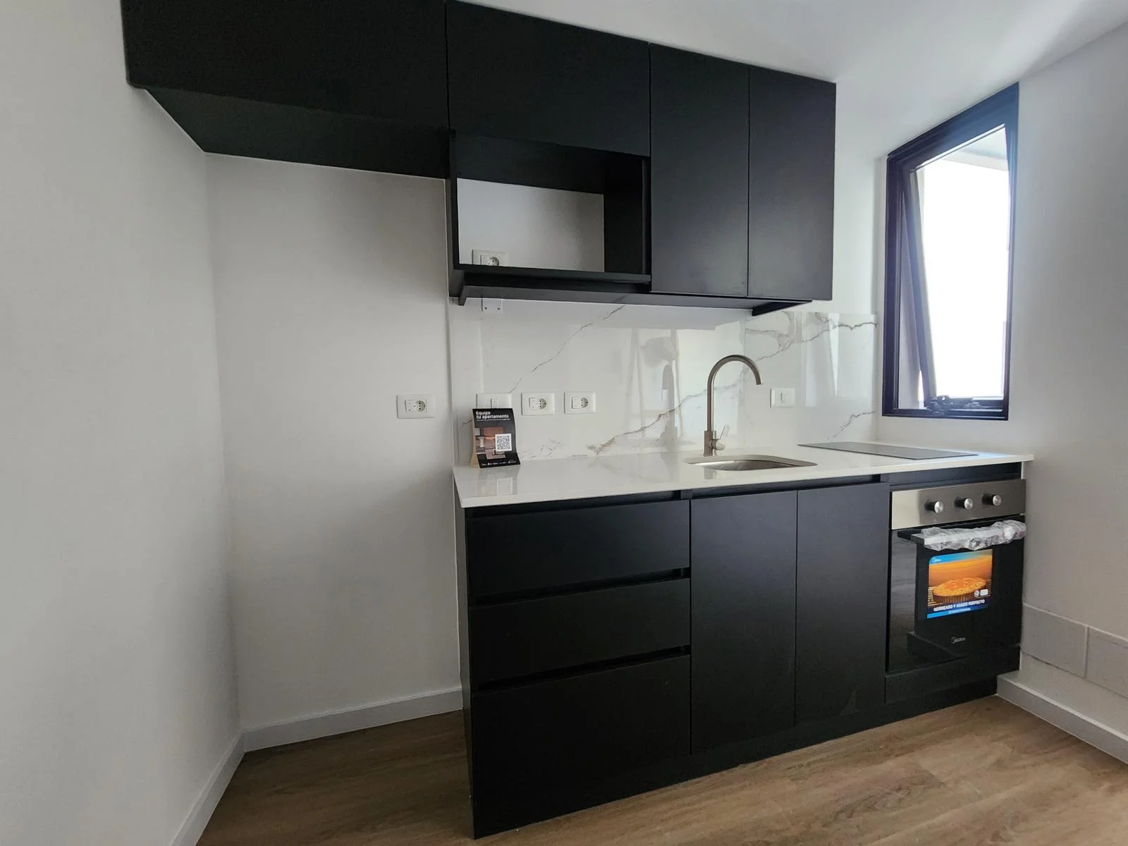 El apartamento cuenta con cocina semi-definida con mesada y aéreos. Ambiente principal con acceso a terraza de uso exclusivo. Baño completo.