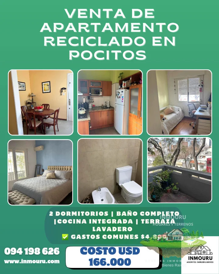 VENTA DE APARTAMENTO EN POCITOS Ubicado por Francisco Muñoz ???? COSTO: USD 166.000 ✅️ Acepta banco | ???? Gastos comunes: $4.800 Características: ✅️2 dormitorios con amplios placares ✅️ 1 baño ✅️ Living comedor integrado a la cocina ✅️ Cocina con placares bajo y sobre mesada, anafe y horno empotrado ✅️ Amplio balcón al frente ✅️ Terraza lavadero con cerramiento en aluminio No tiene garage propio, pero se puede alquilar uno en el edificio. Honorarios: 3% Agente Vanesa Referencia Interna : Tera-1783