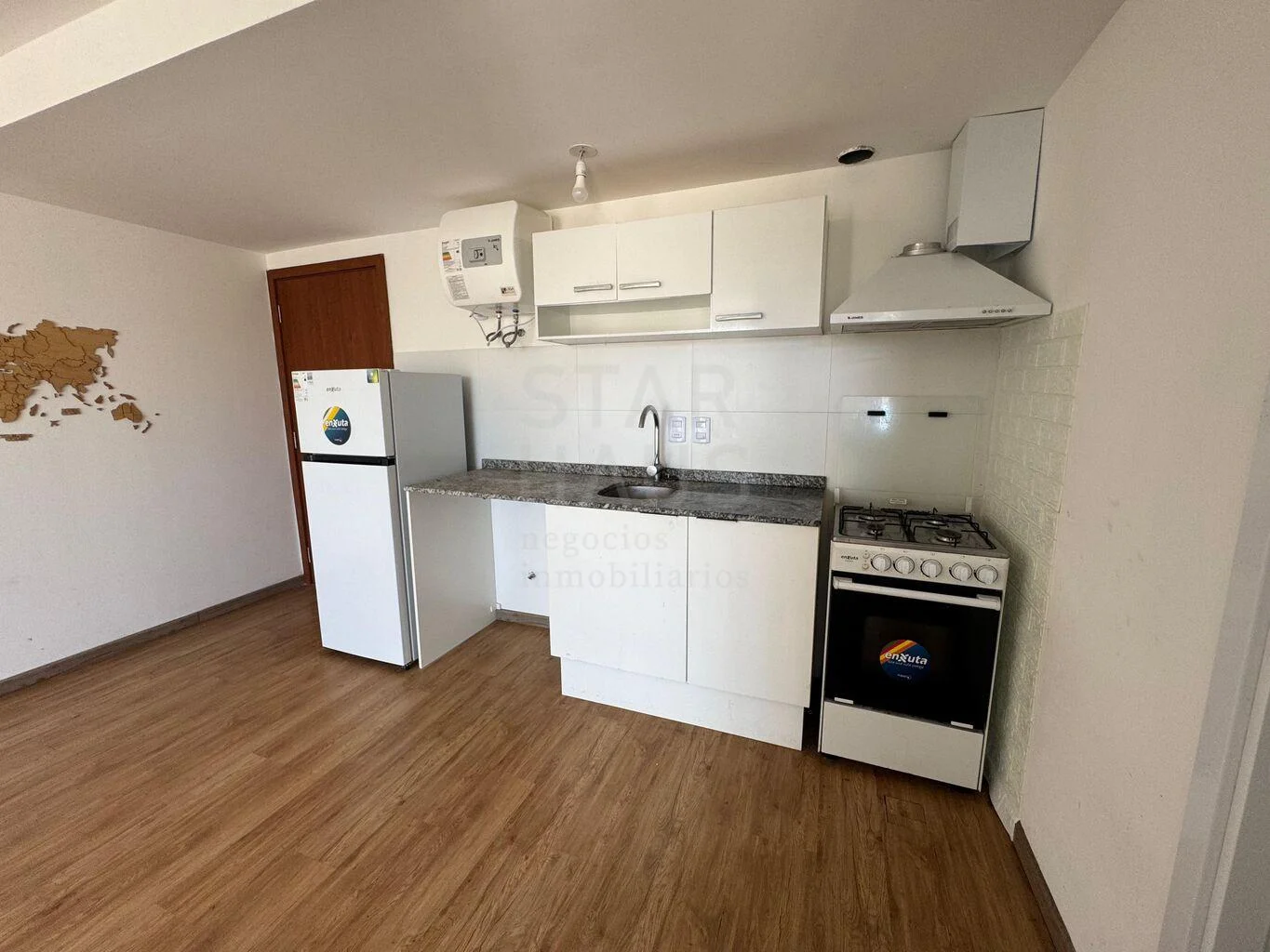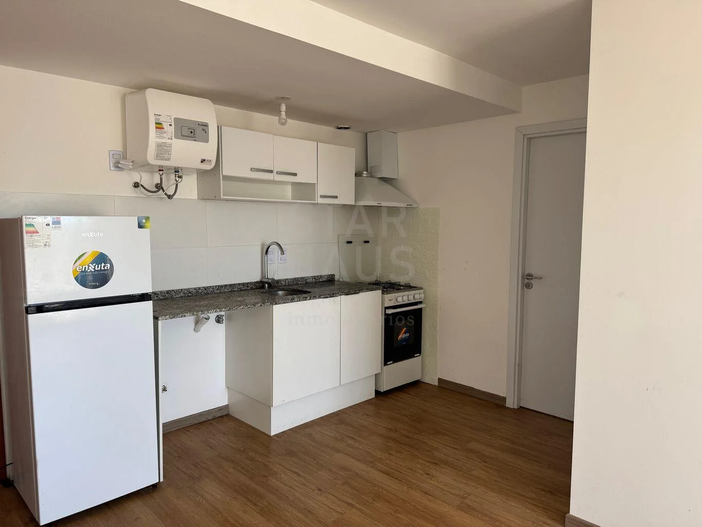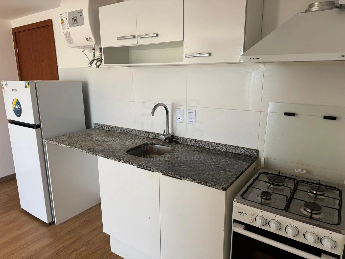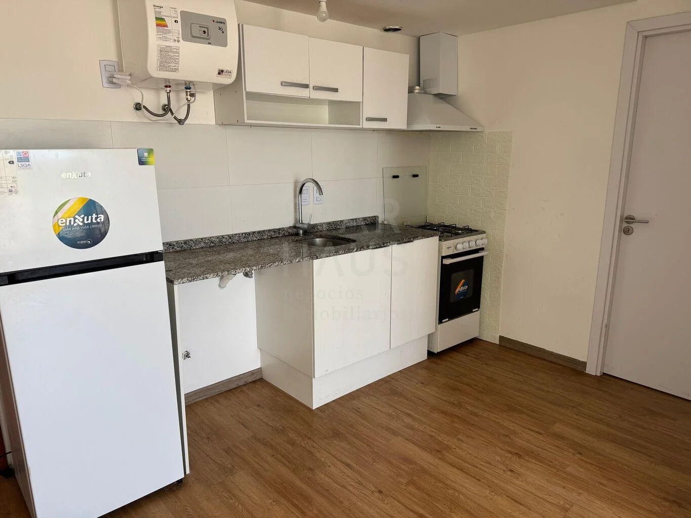 Cocina semi integrada de cómodas dimensiones, con aéreos sobre y bajo mesada. Equipada con heladera, cocina, calefón y campana Extractora.