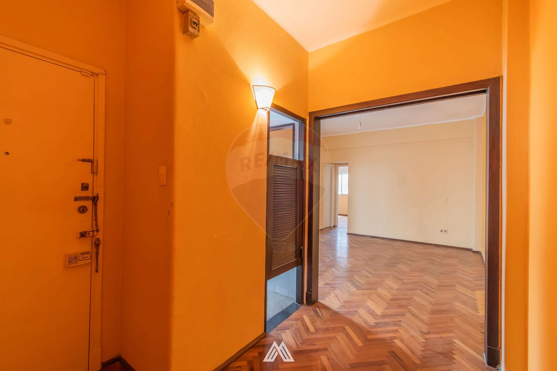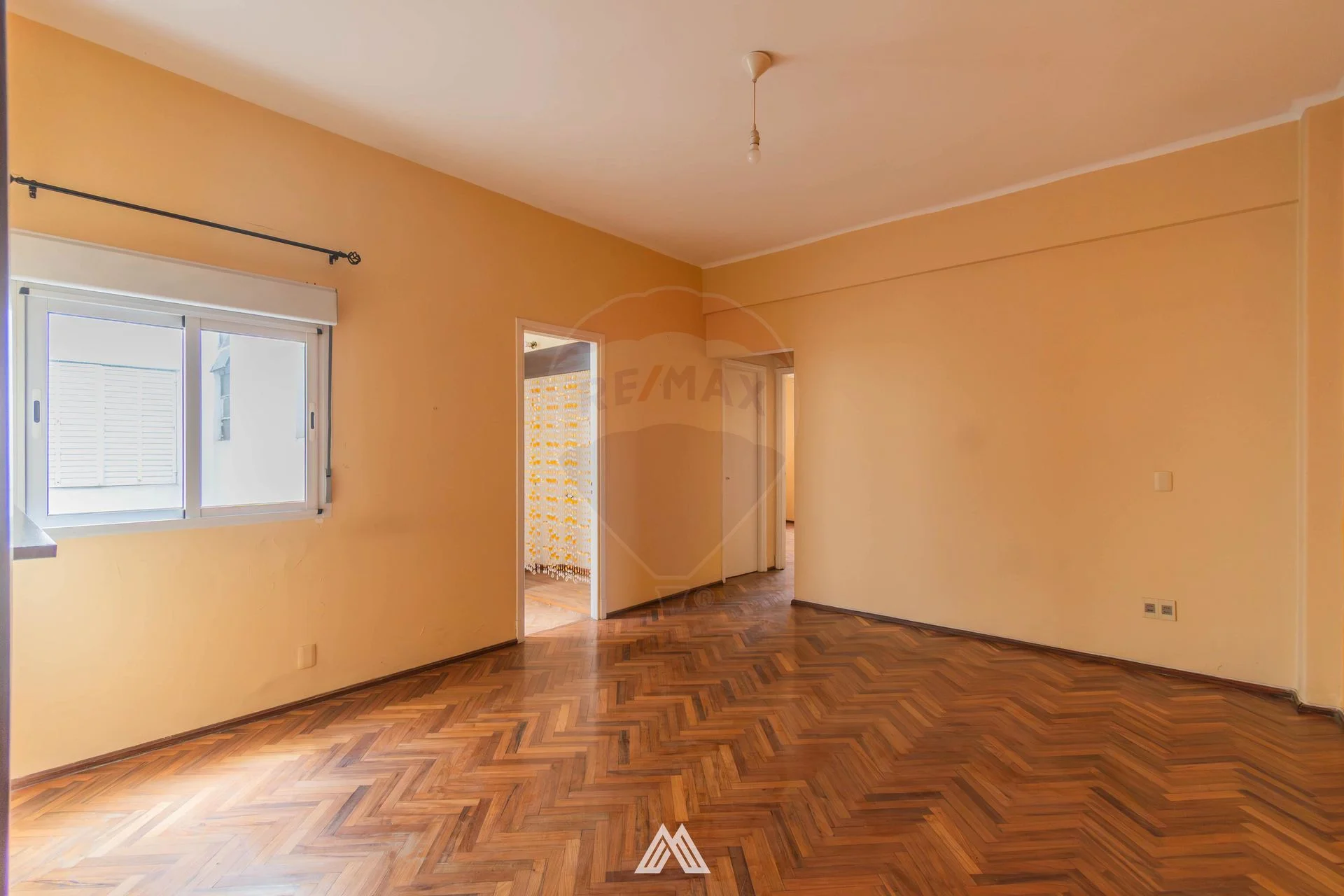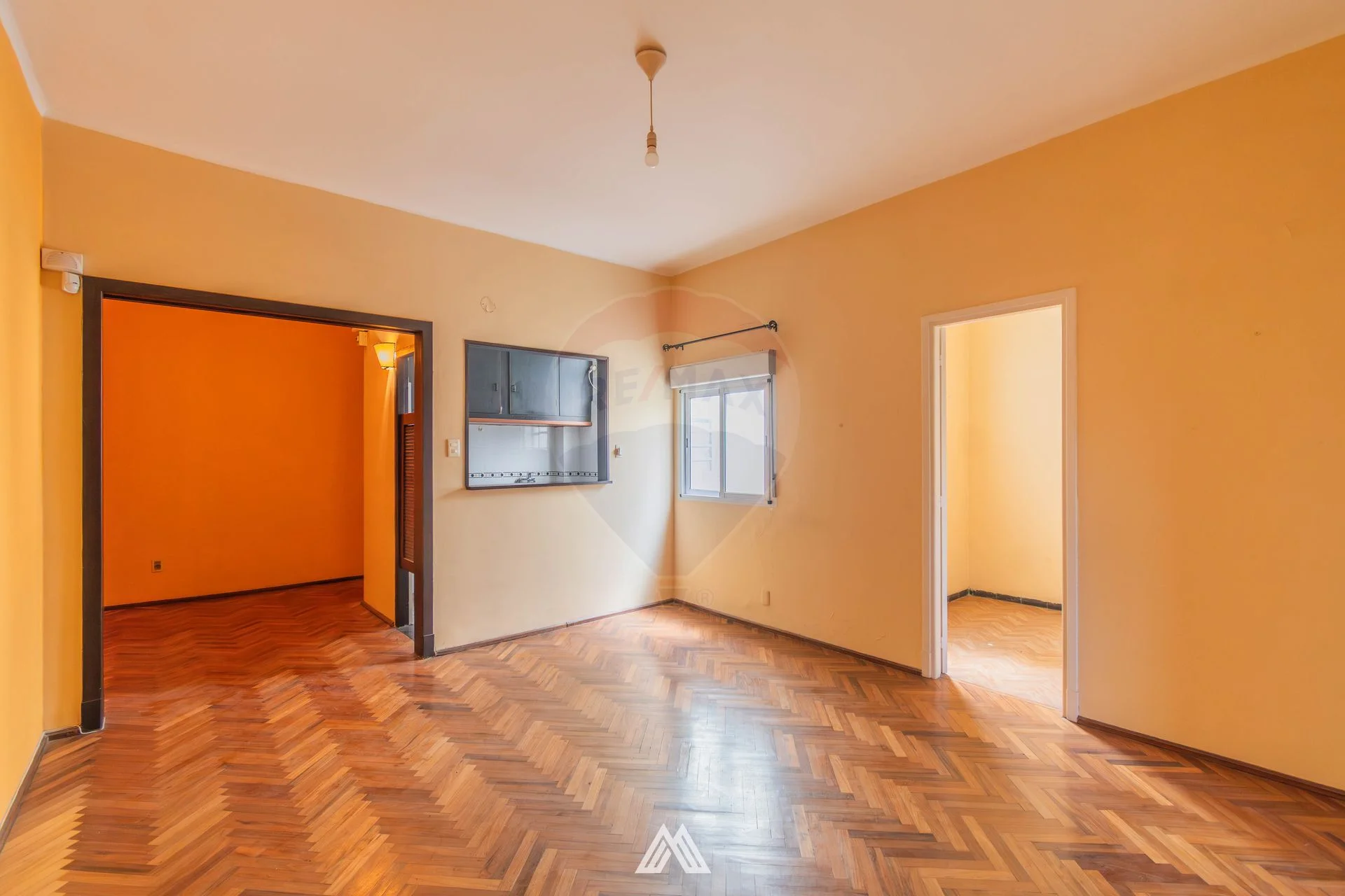 El apartamento presenta pisos de parquet originales plastificados en excelente estado, persianas funcionales en dormitorios y living-comedor, y un baño completo con mampara de vidrio templado y revestimientos con cerámica española.