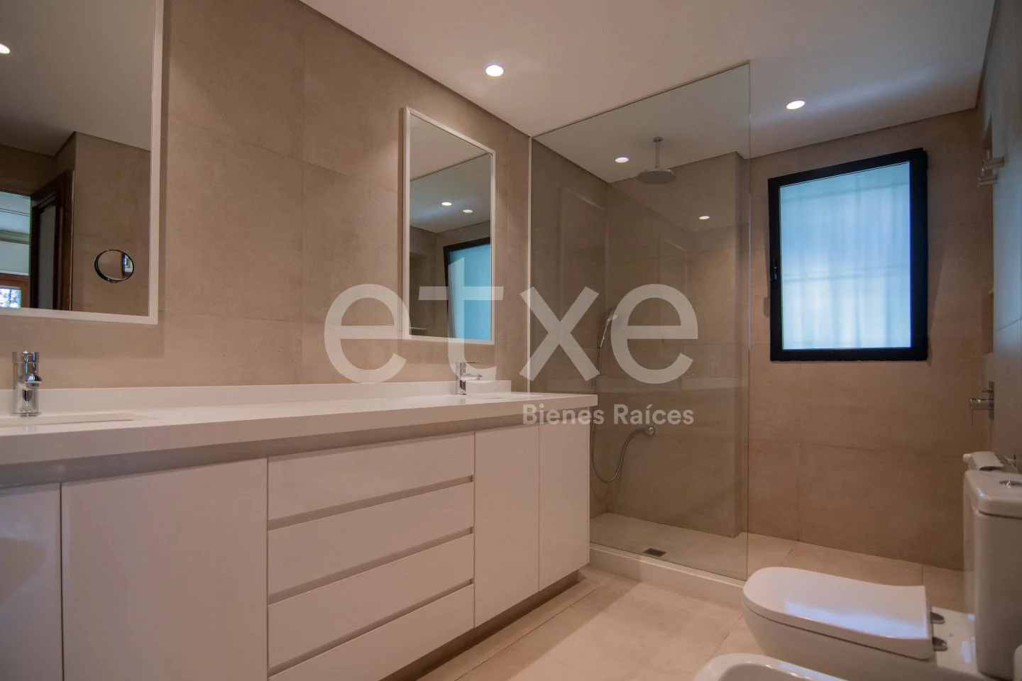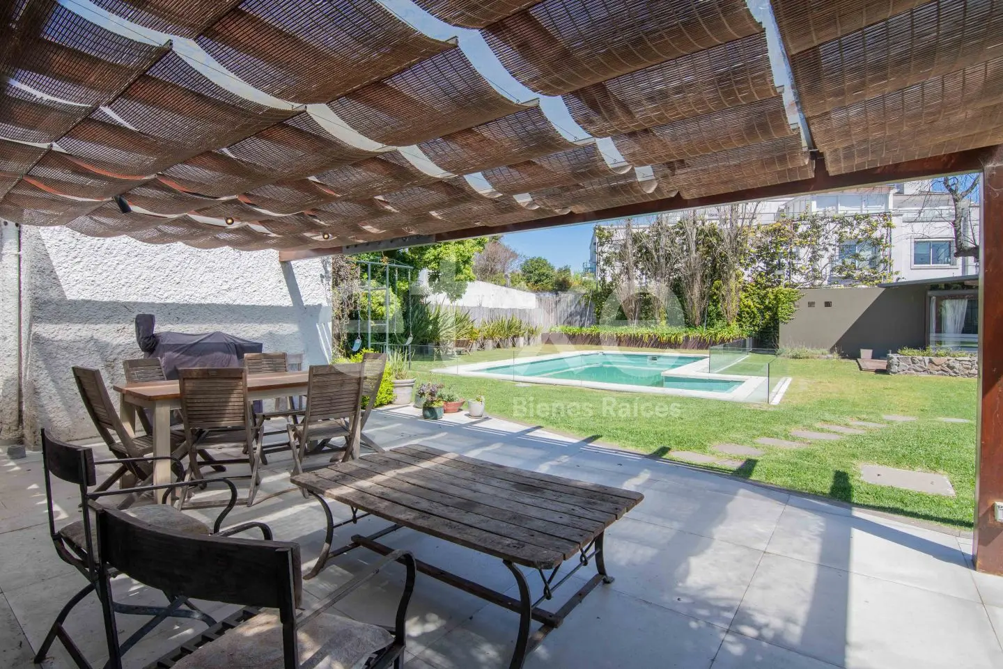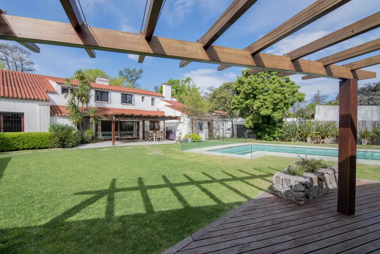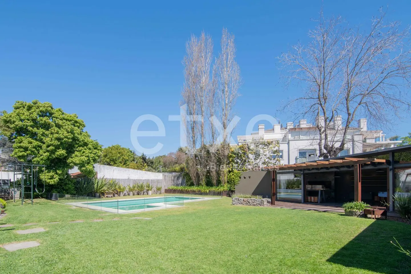 En planta baja se desarrolla un elegante hall de recepción con gran despojador, living con ventanales al jardín, comedor definido y amplio estar con salida directa al fondo. Cuenta además con un segundo despojador, escritorio, toilette, moderna cocina con comedor diario, baño, lavadero y servicio completo . Dos cómodos dormitorios en suite, incluyendo la suite principal con doble vestidor.