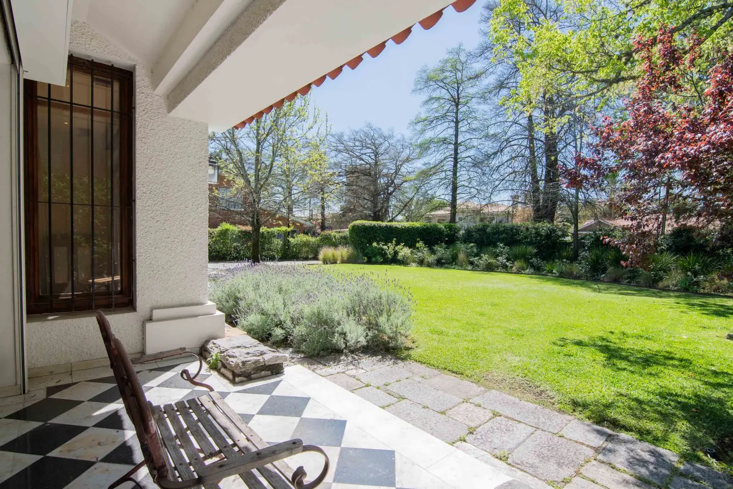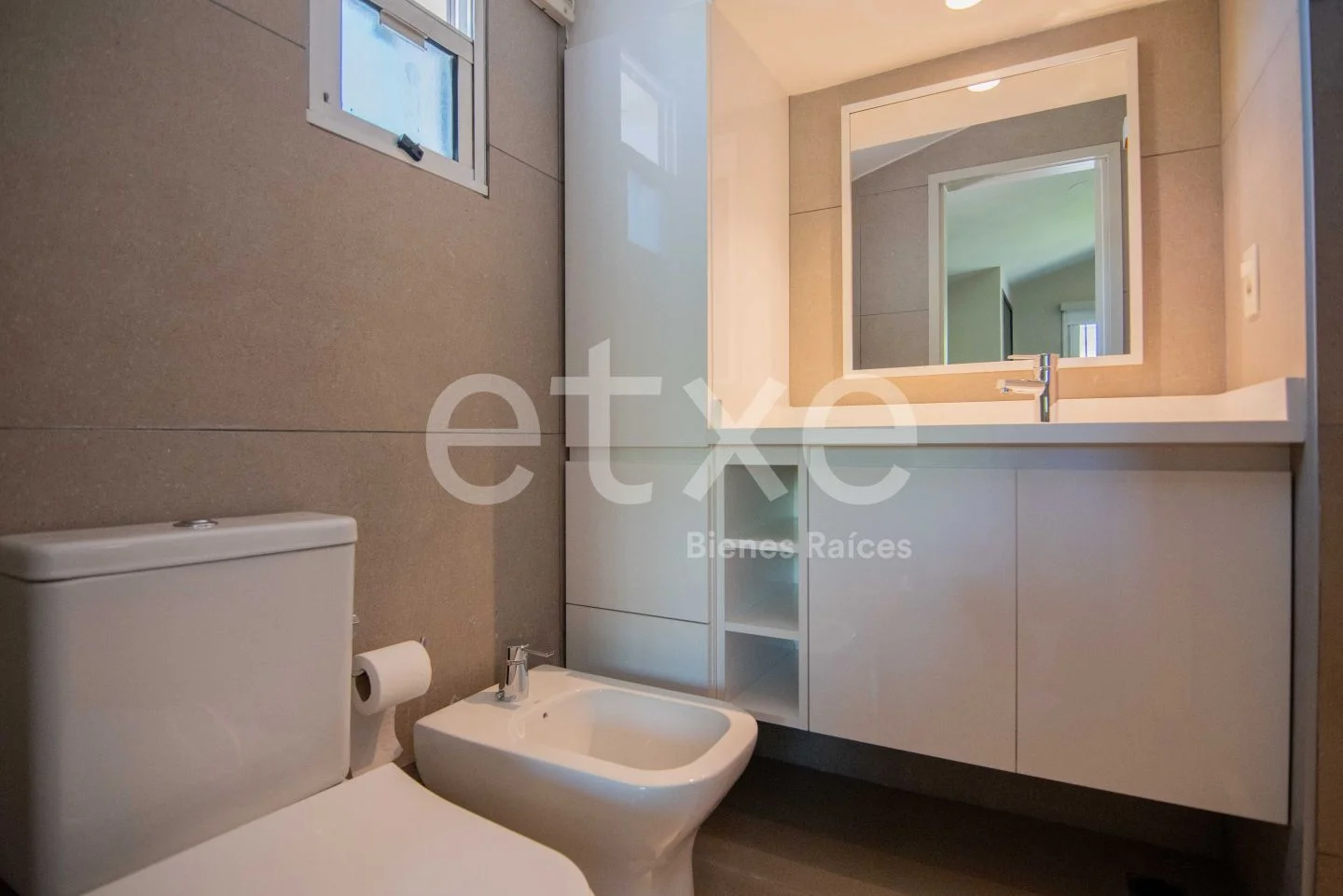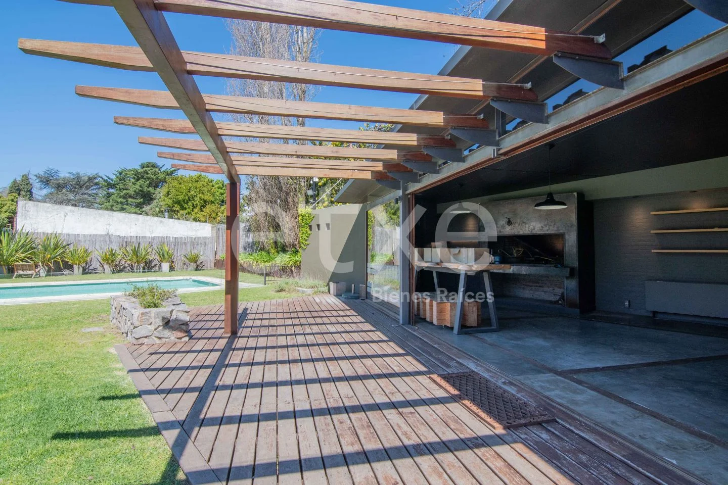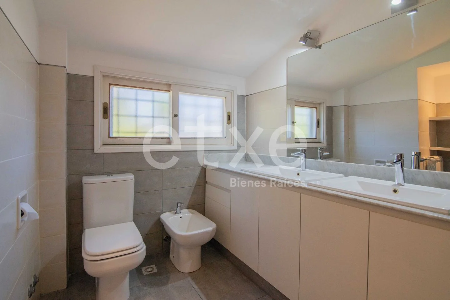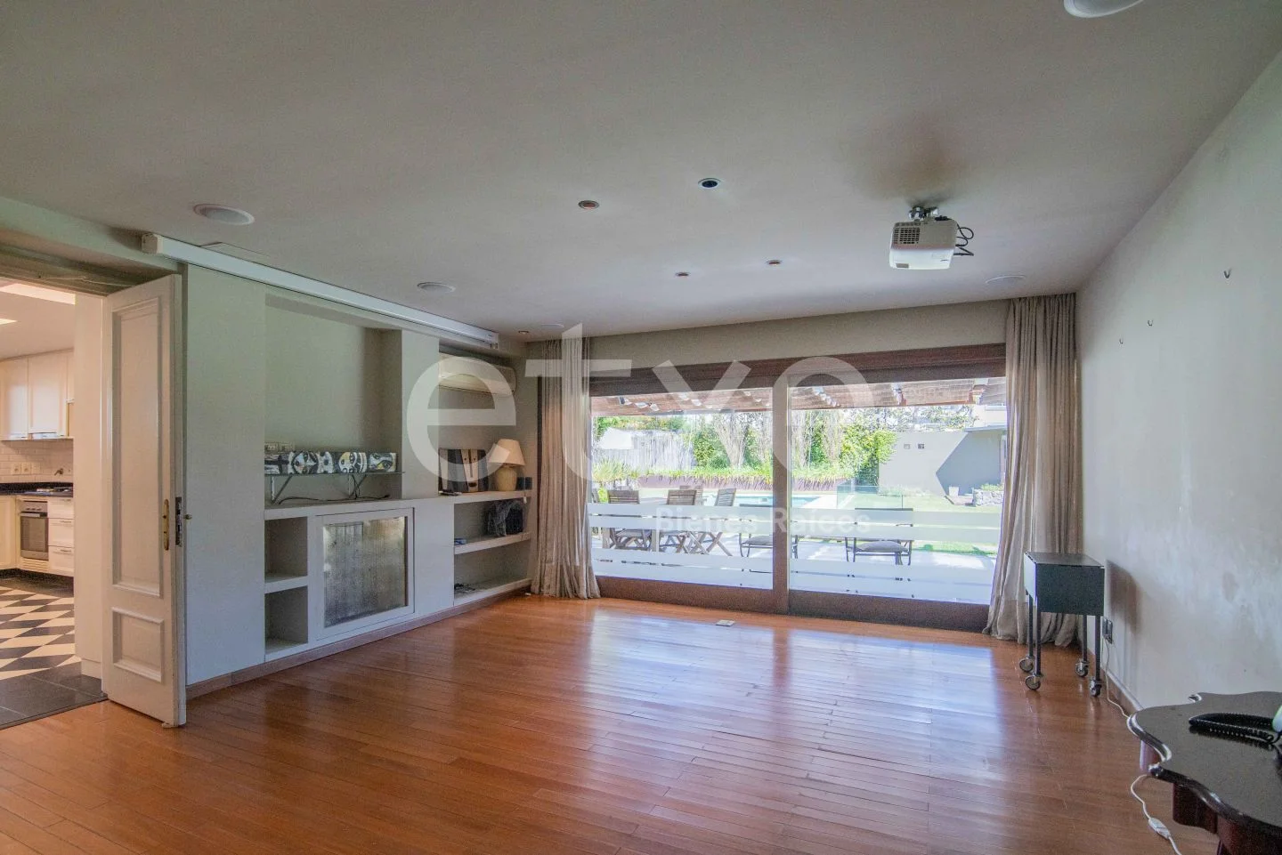 En planta baja se desarrolla un elegante hall de recepción con gran despojador, living con ventanales al jardín, comedor definido y amplio estar con salida directa al fondo. Cuenta además con un segundo despojador, escritorio, toilette, moderna cocina con comedor diario, baño, lavadero y servicio completo . Dos cómodos dormitorios en suite, incluyendo la suite principal con doble vestidor.