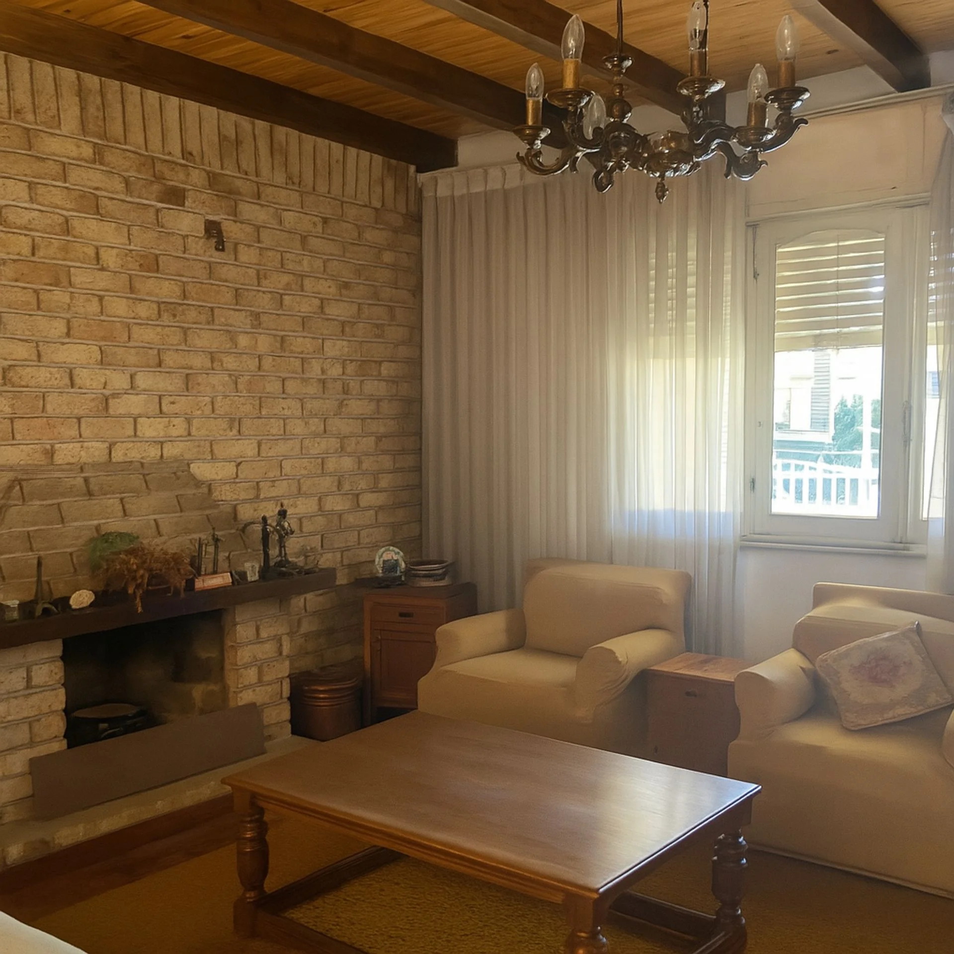 En la casa del frente ingresamos por el living comedor, luminoso y amplio, el cual tiene una estufa a leña, ideal para compartir momentos en familia y con amigos.