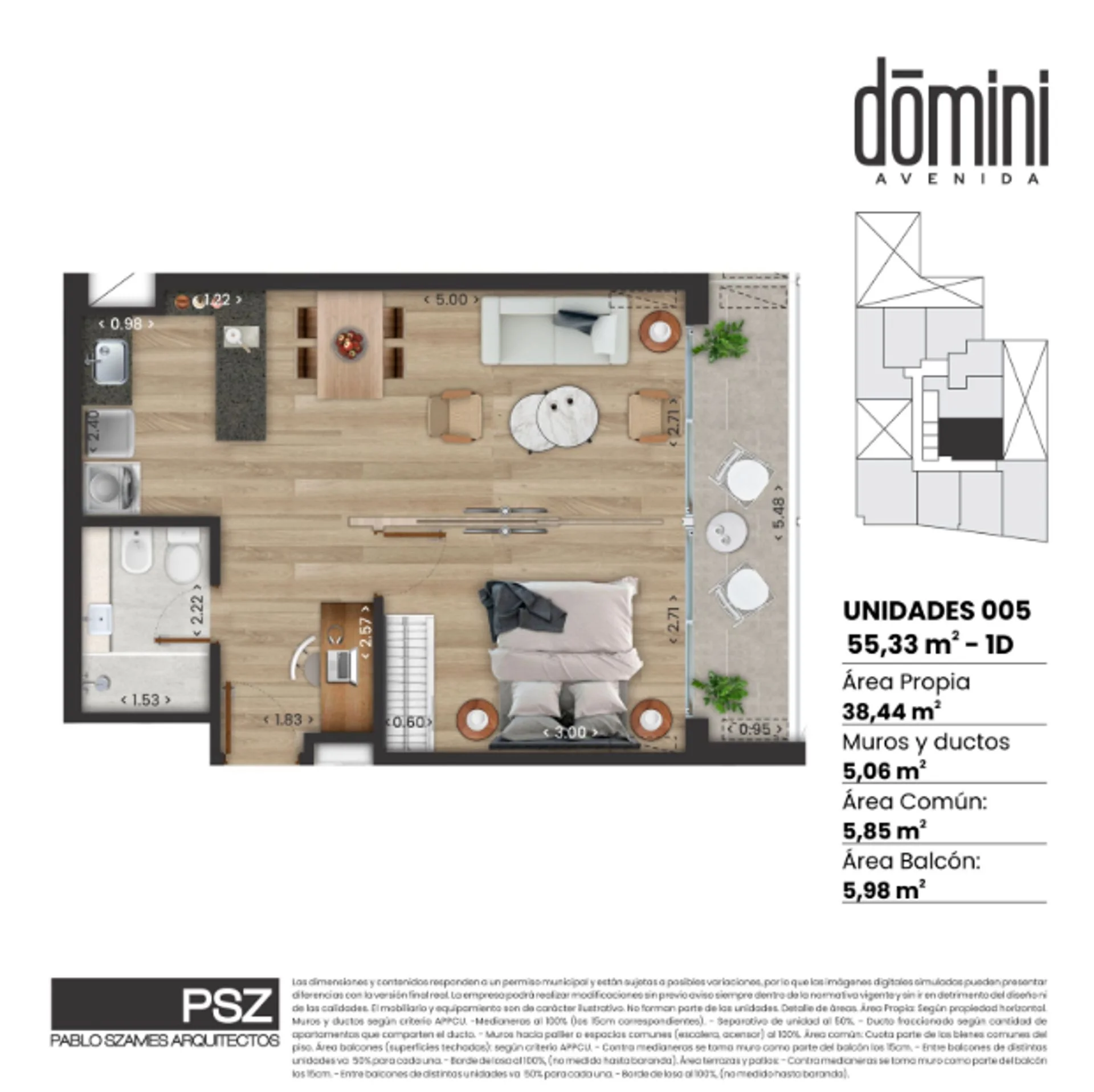La unidad cuenta con 38,44 m2 edificados y 5,98 m2 de terraza. Es una unidad con orientación norte apaisada brindando mayor amplitud y comodidad a la hora de la disposición del ambiente.