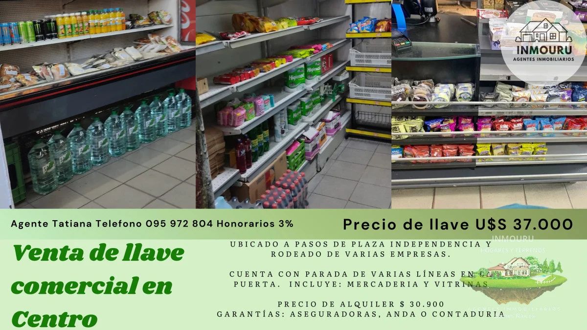 Venta de llave comercial en Centro- Kiosco Precio de la llave U$S 37.000 Precio de alquiler $ 30.900 Garantías: Aseguradoras, ANDA o C.G.N. El local se encuentra a pasos de la plaza independencia con una gran afluencia. El mismo se encuentra abierto las 24 horas. El local es de 18 metros cuadrados e incluye la mercadería y vitrinas. Es un salón principal, mostrador con exhibidor de mercaderia. Heladeras, vitrina, gondola, baño. Mercadería varias, vitrina de panificados. Habilitaciones al día. Honorarios 3% Agente Tatiana Referencia Interna : Tera-1982