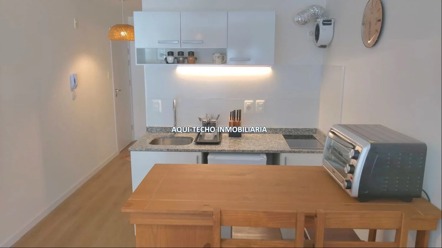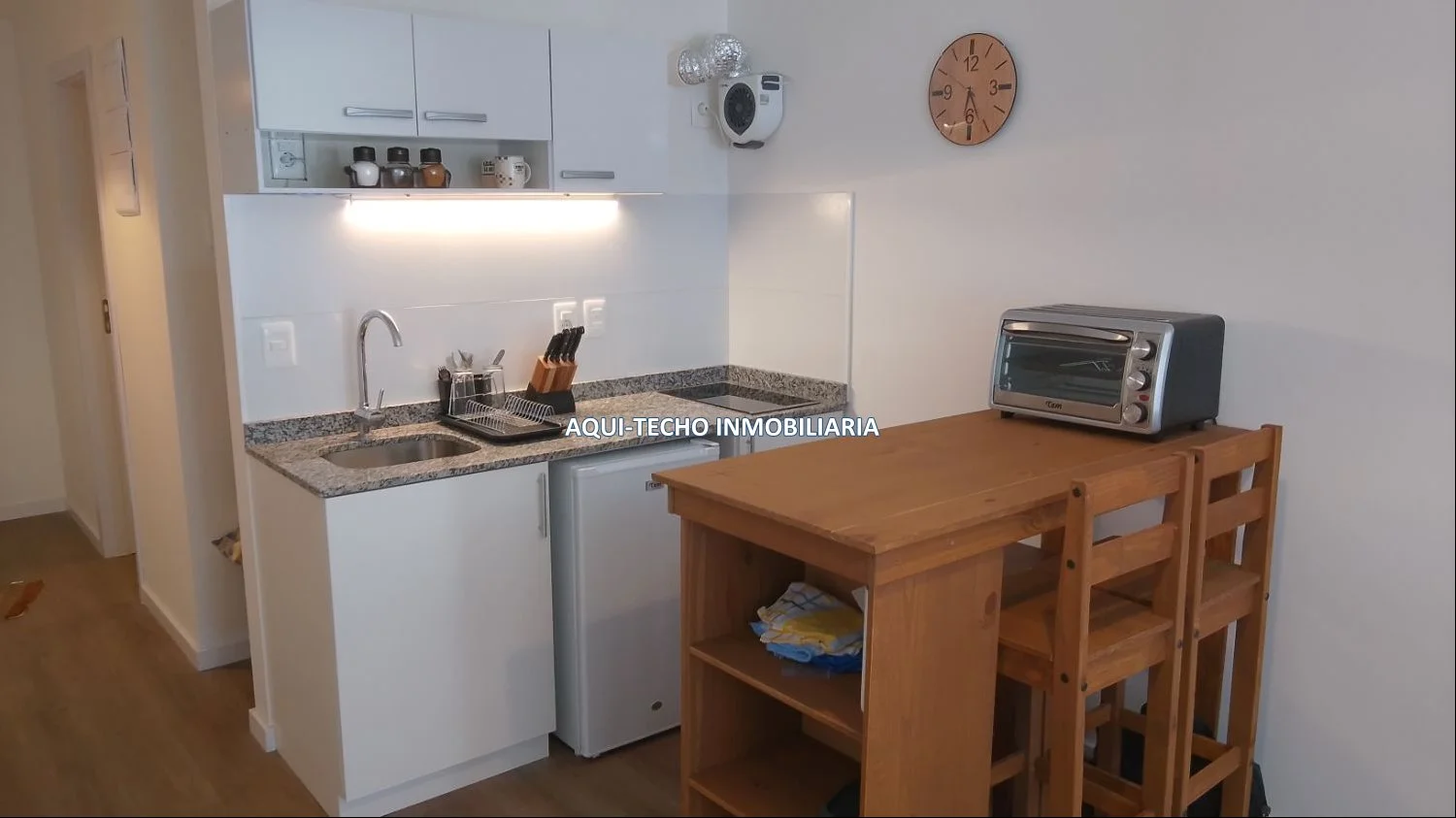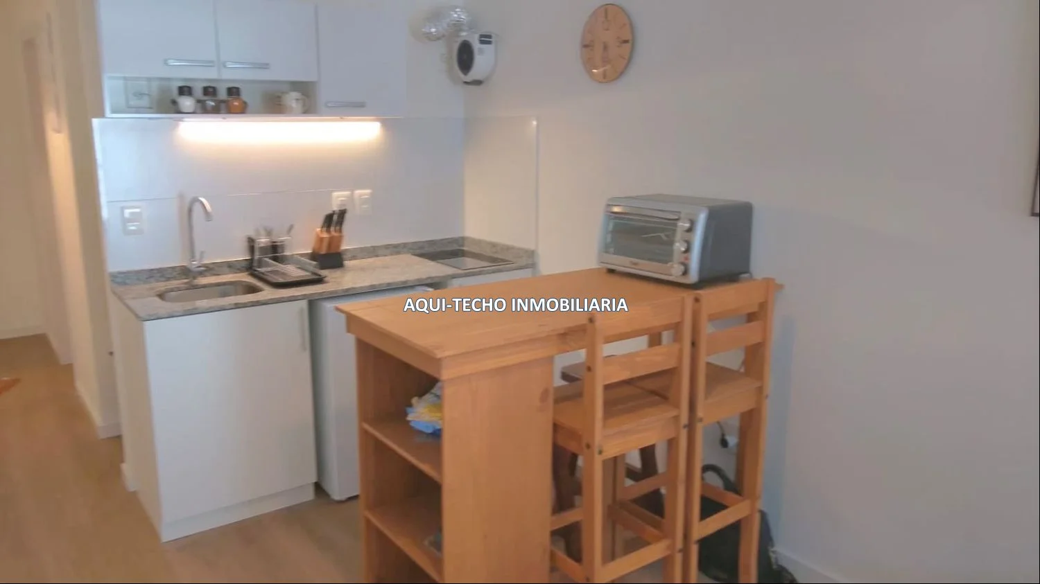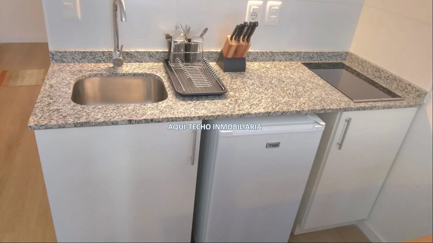 Kitchenette equipada con anafe, muebles aéreos y bajo mesada.