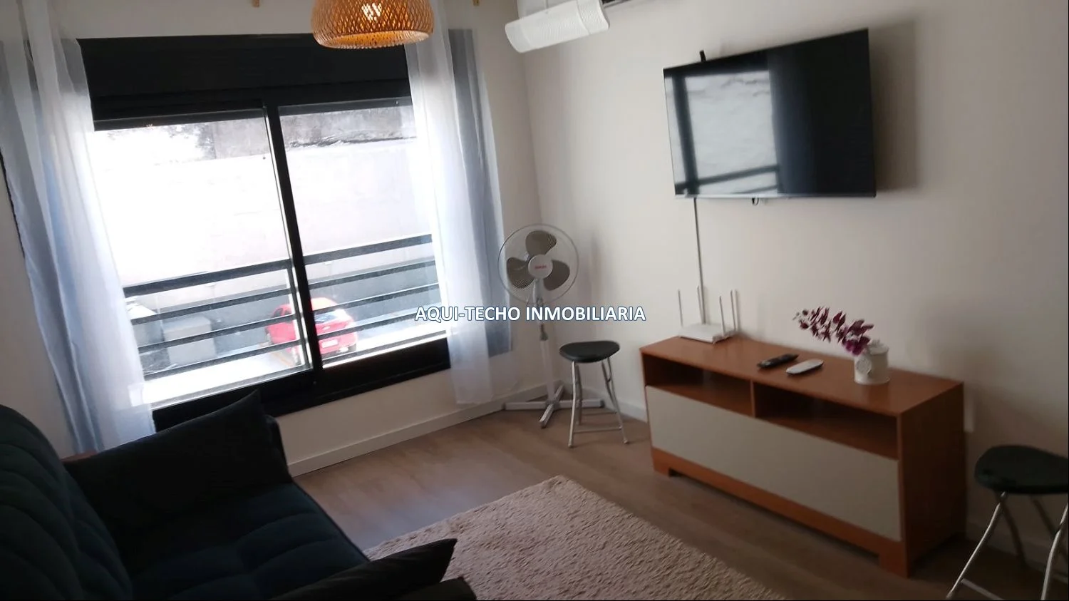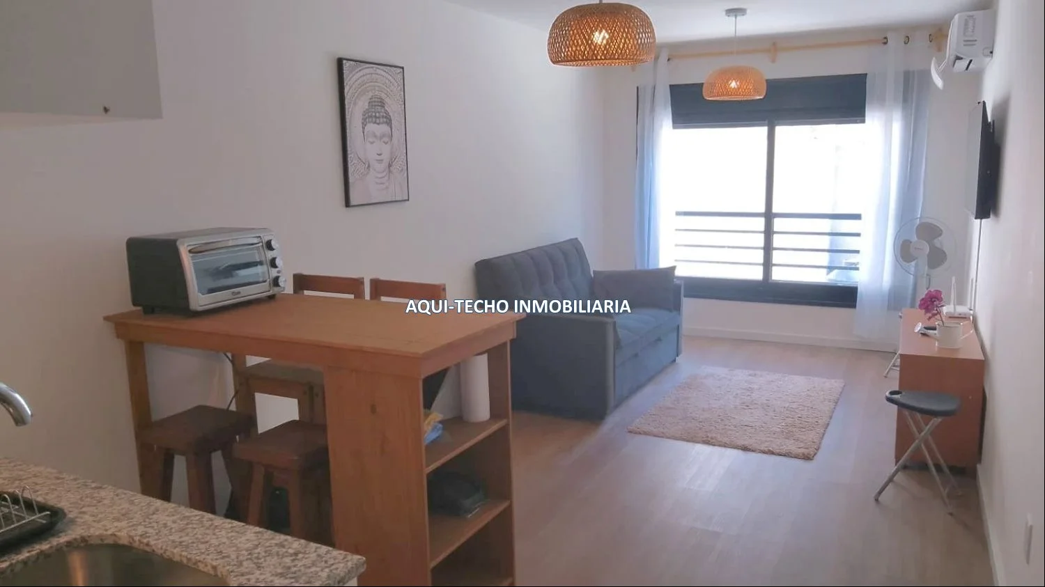 Aire acondicionado, sofá cama, rack, TV plasma y desayunador.