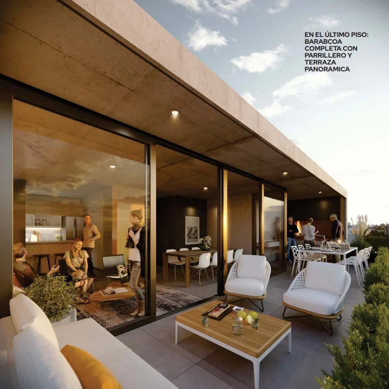 Además contará con: Salón de uso común con parrillero y equipamiento, y terraza solárium al frente. Lavadero, CCTV (Circuito Cerrado de Televisión). Gimnasio equipado, playroom y terraza lounge al fondo.