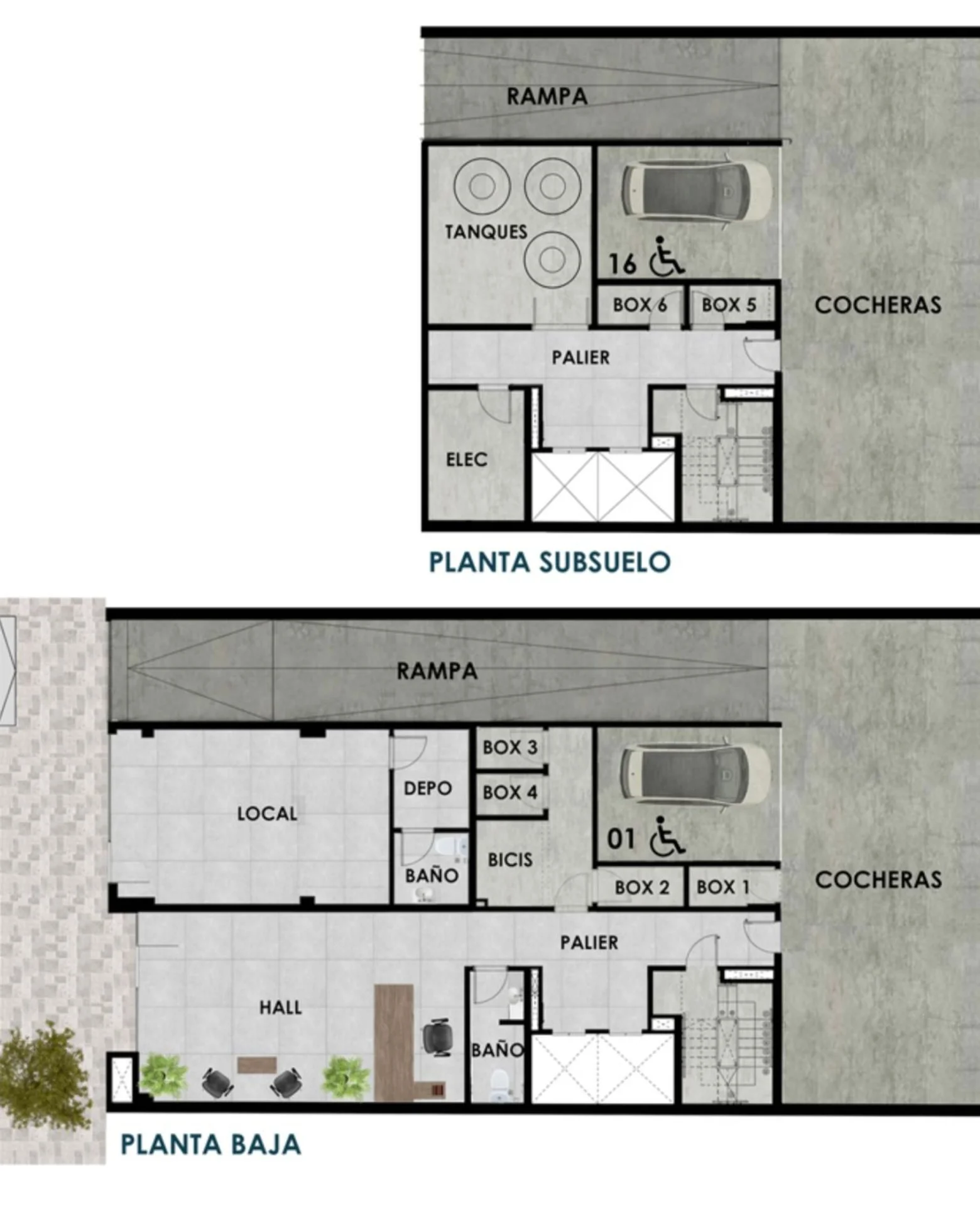 56 apartamentos distribuidos en monoambientes, 1 y 2 dormitorios.