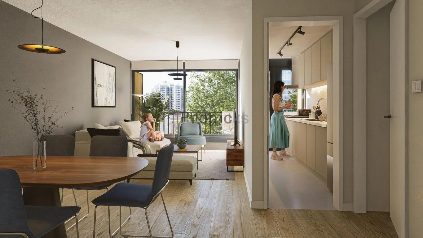 La unidad se desarrolla en un espacio funcional y luminoso que se expande hacia un patio privado, otorgando mayor confort y versatilidad de uso.