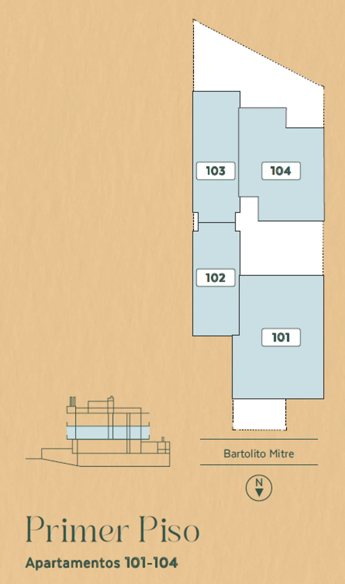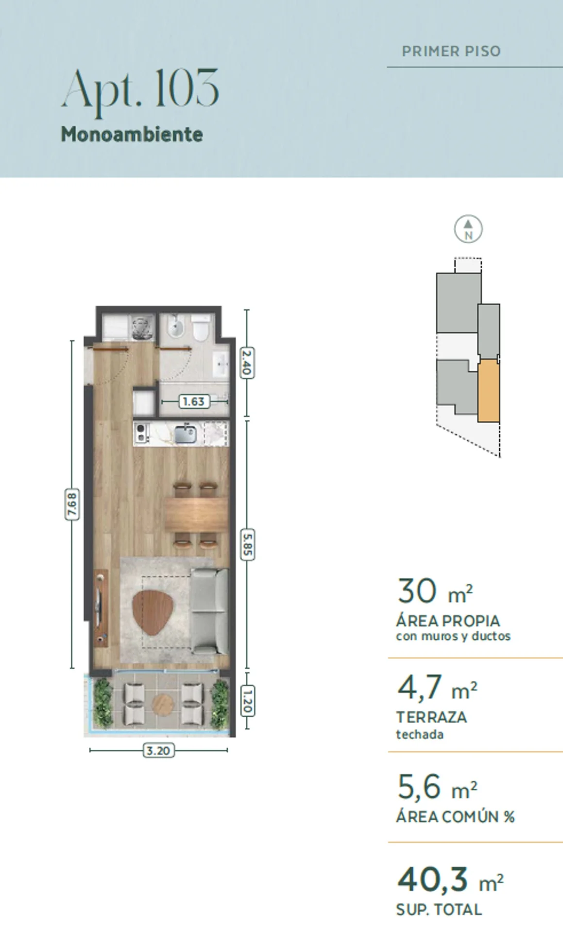 La unidad 103 se ubica al contrafrente, en el primer piso, y cuenta con:
