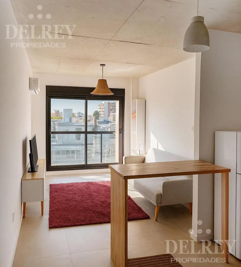 Monoambiente en piso 2 con balcón, cocina (mesada de granito negro, placares bajo y sobre la mesada) integrada con barra, baño completo.