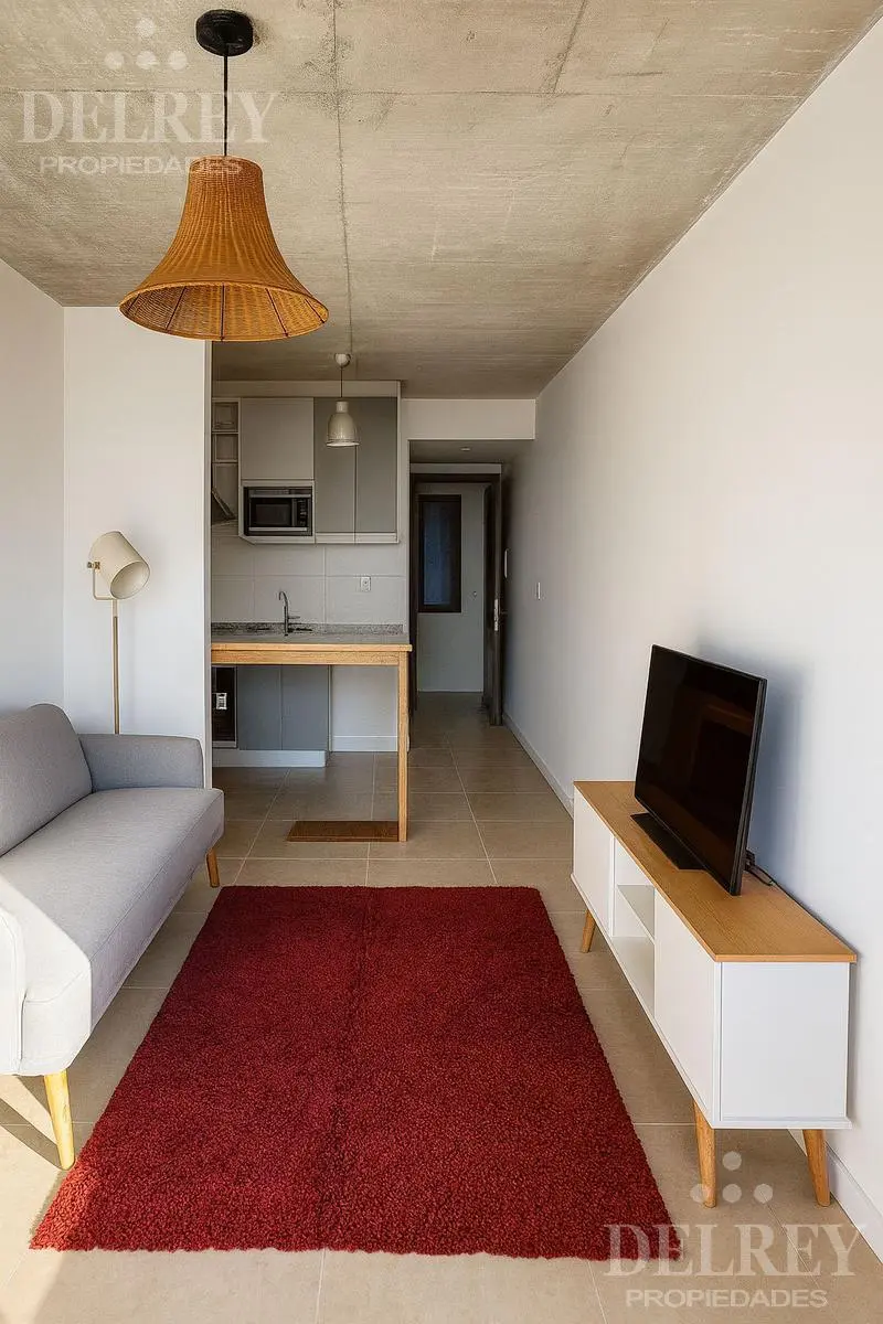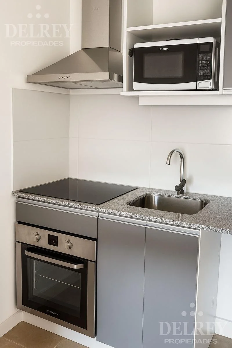 Monoambiente en piso 2 con balcón, cocina (mesada de granito negro, placares bajo y sobre la mesada) integrada con barra, baño completo.