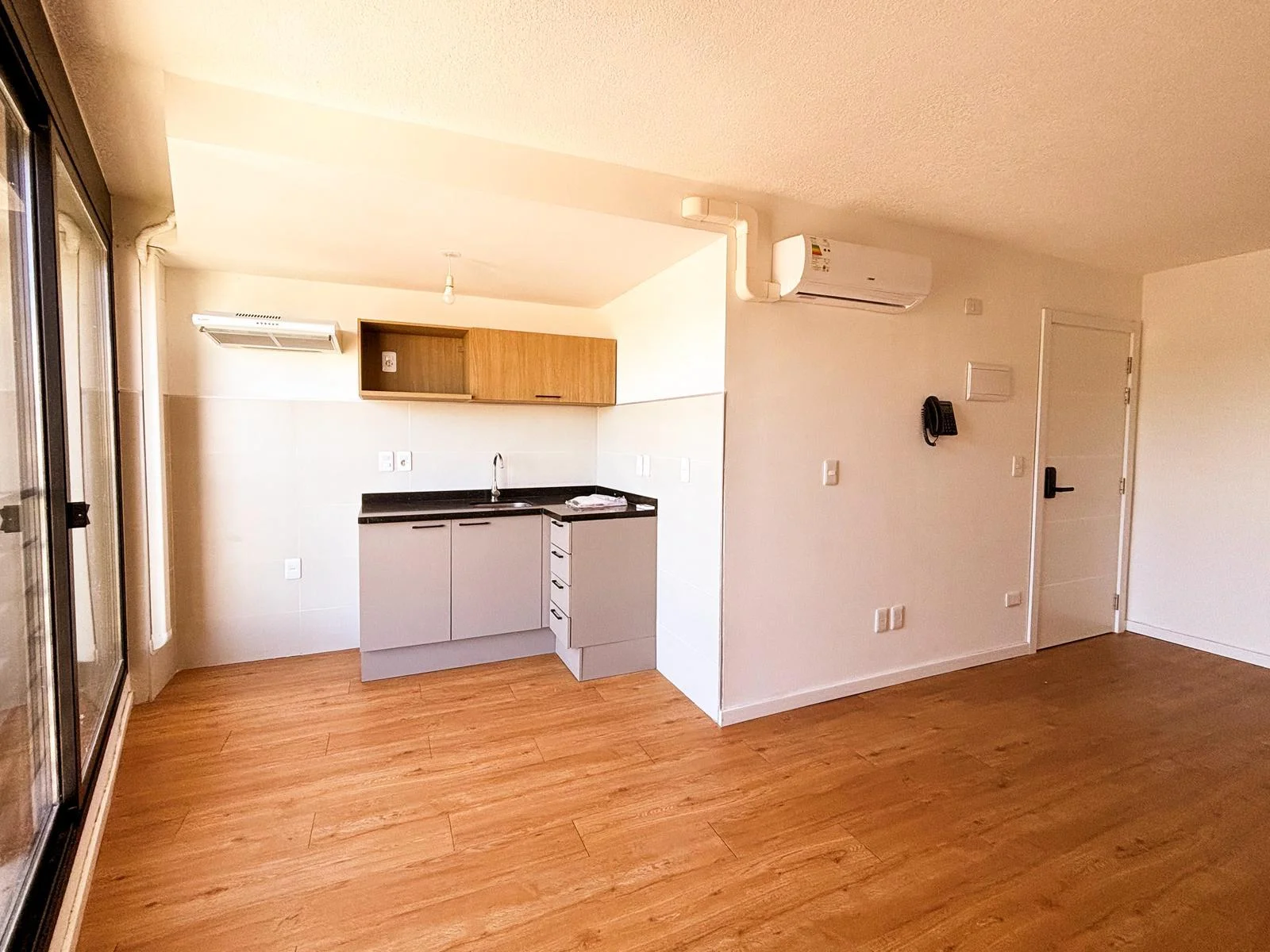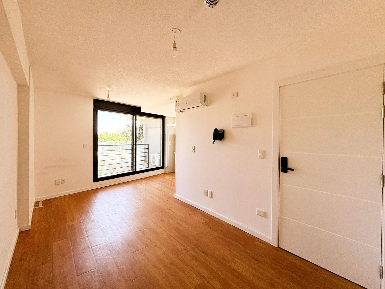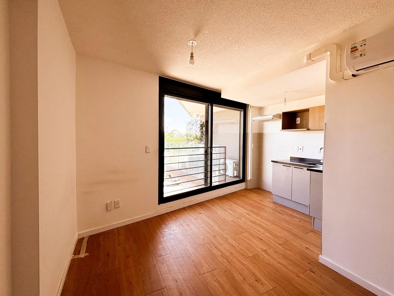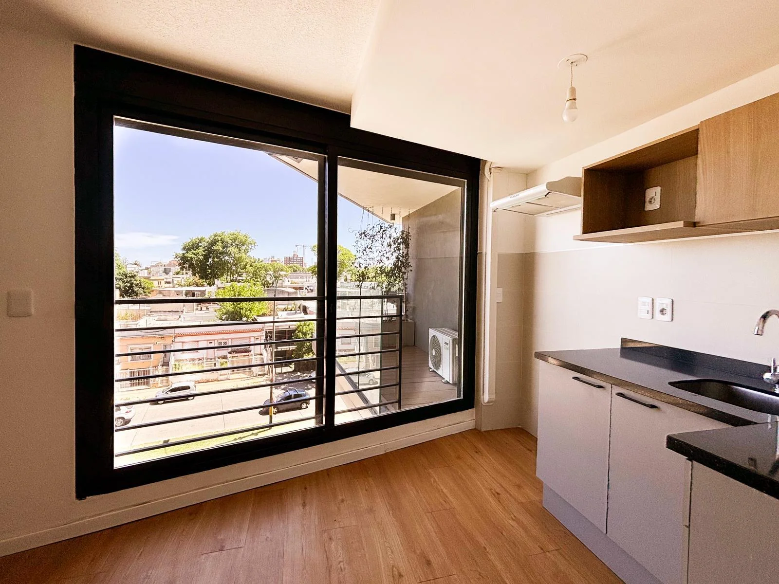 Cocina integrada de concepto abierto con mesada en "L", muebles aéreos y bajo mesada | Salida a balcón | Ambiente con ventanal | Cortinas de enrollar motorizadas | Aire acondicionado | Baño completo con conexión para lavadora y calefón | Acceso digital a la unidad con portero inteligente.