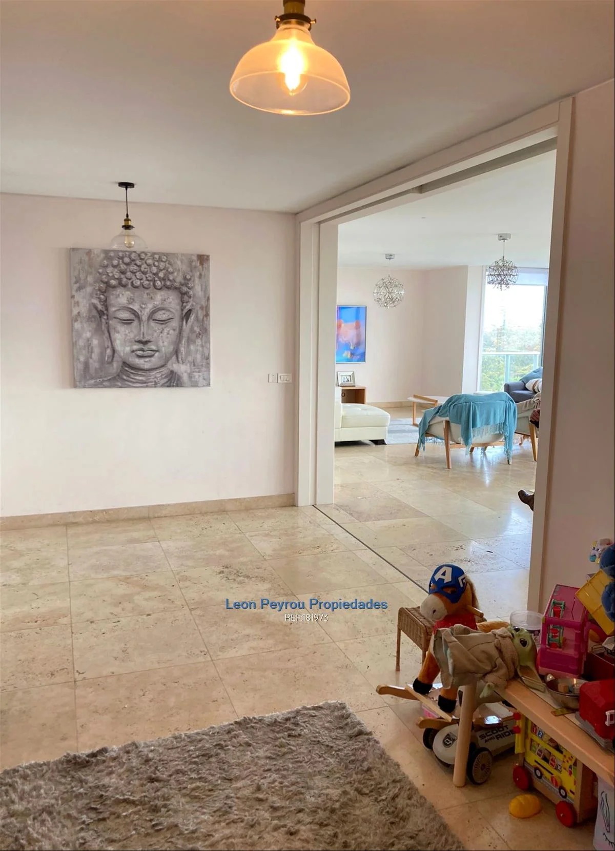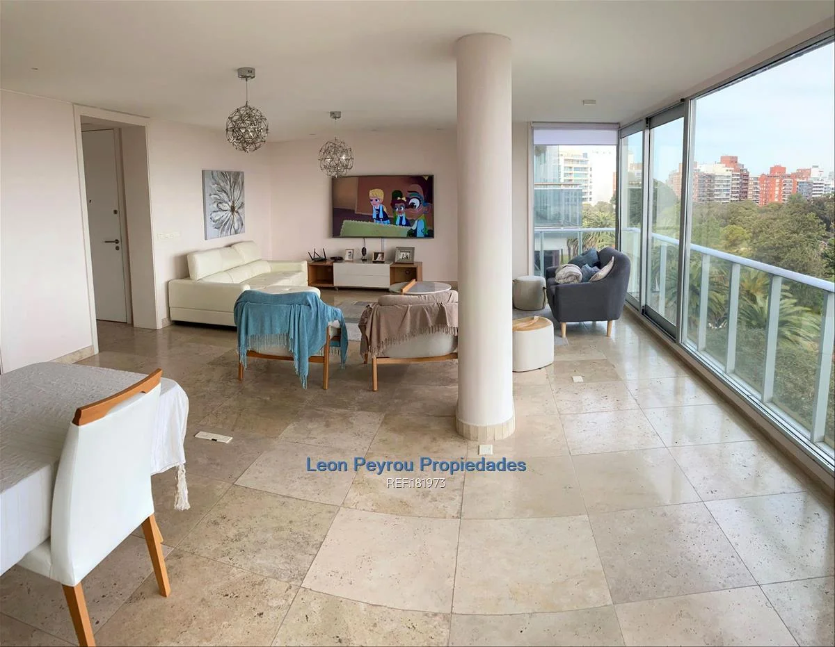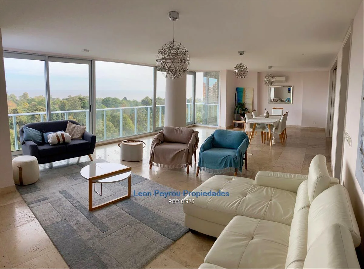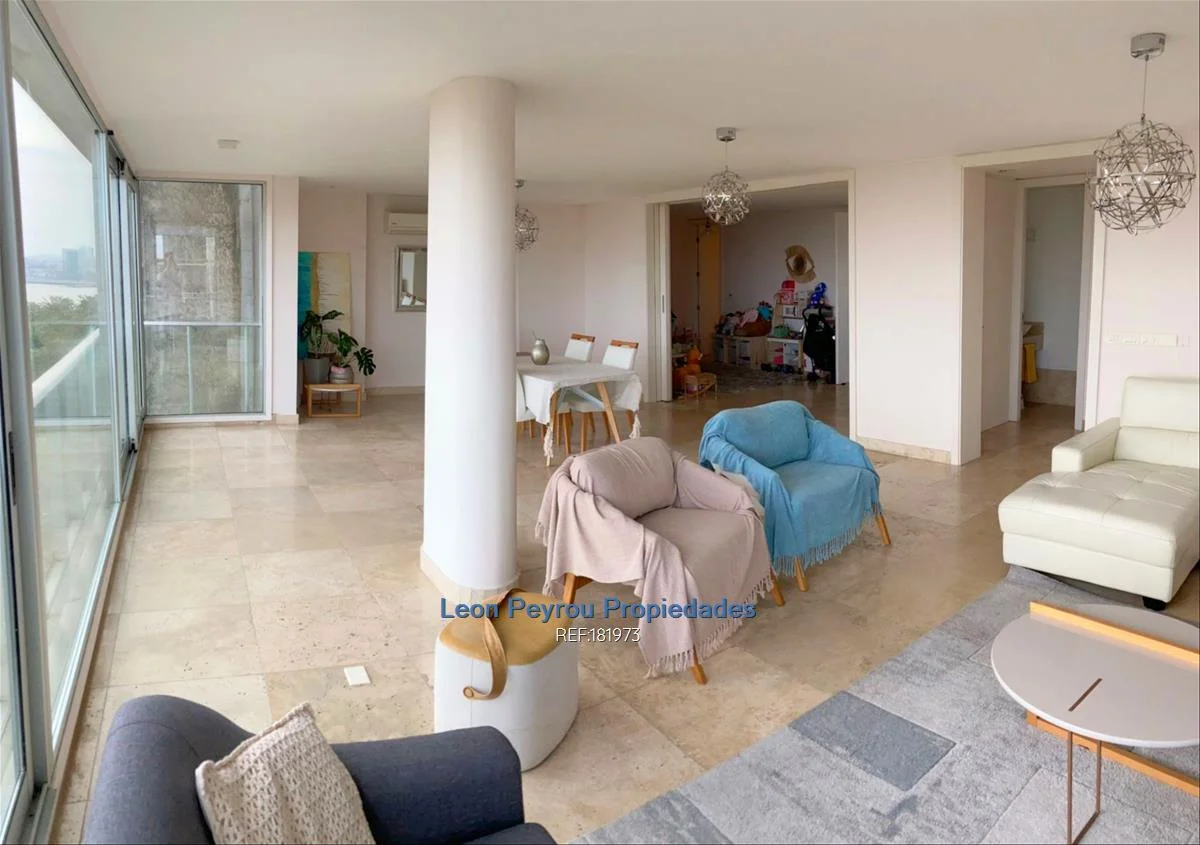Living comedor de 10,5 x 5 mts, ventanales de piso a techo.