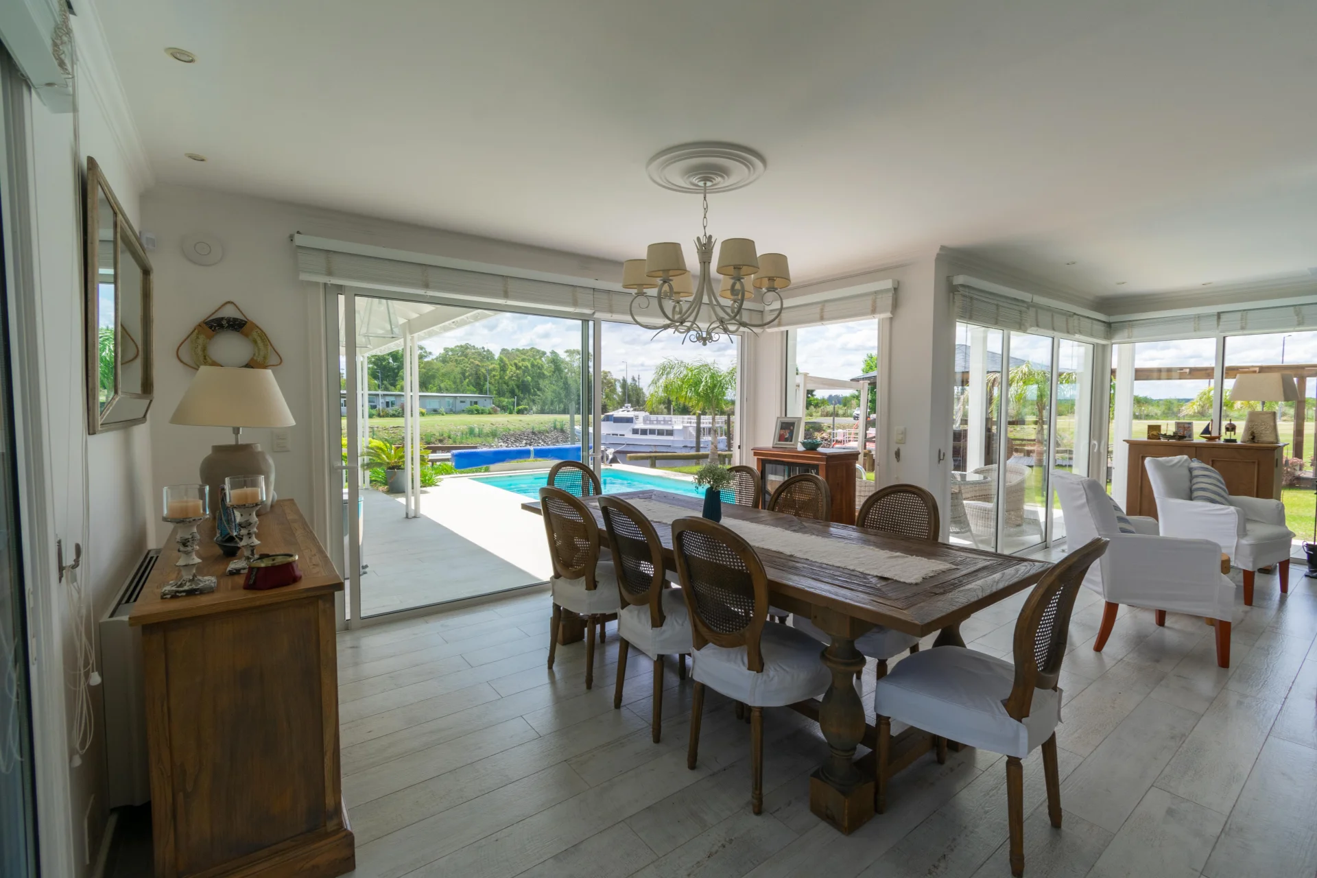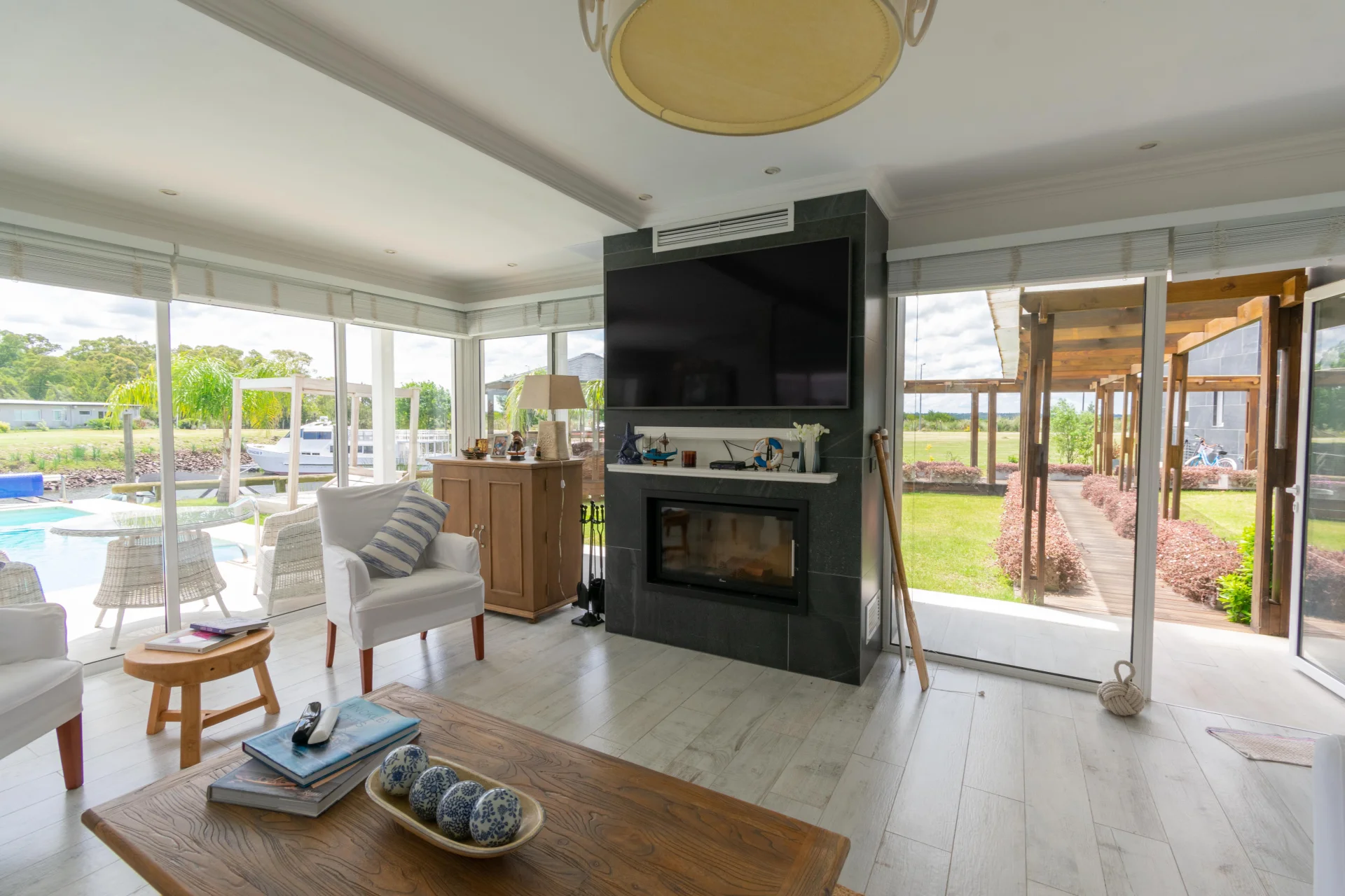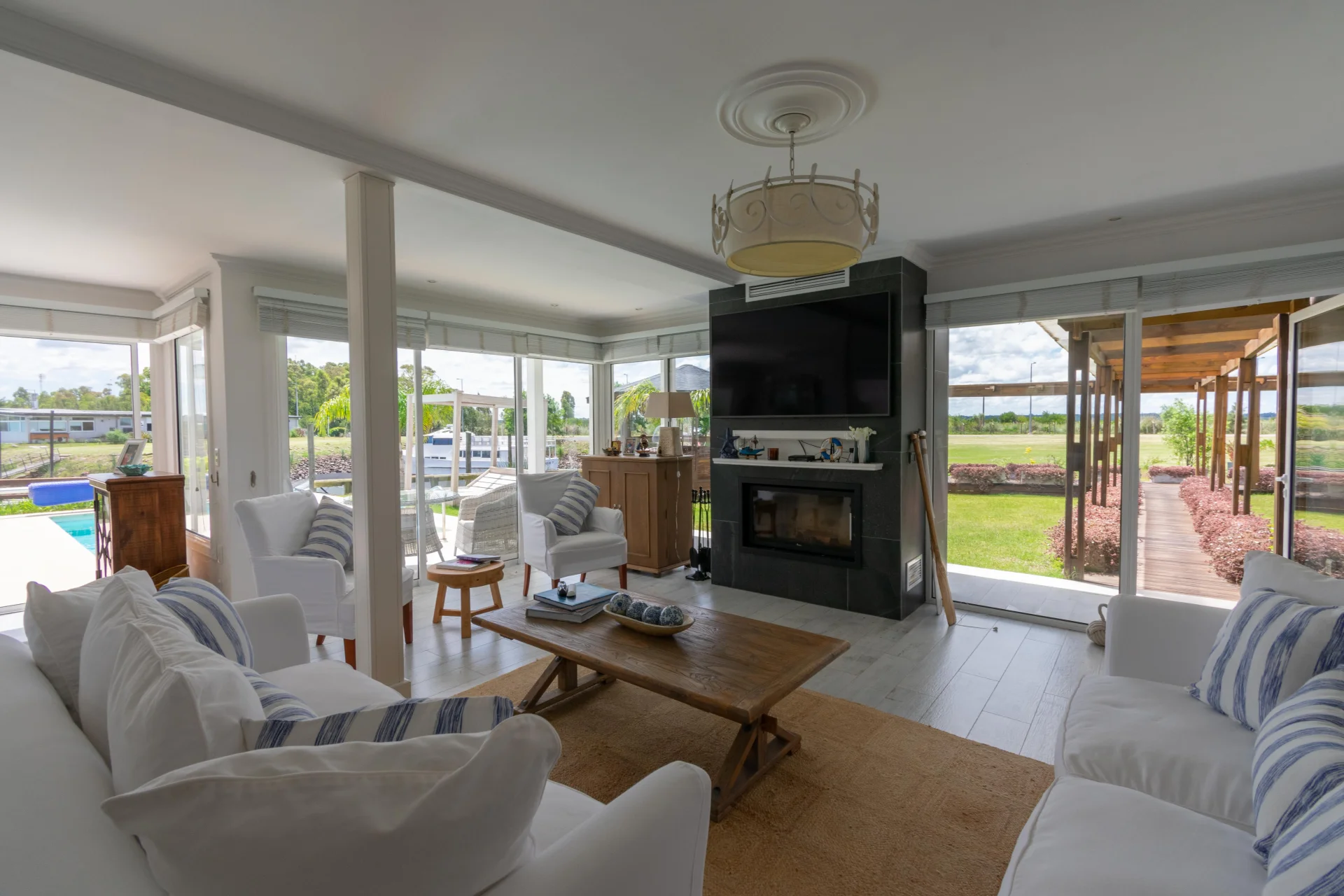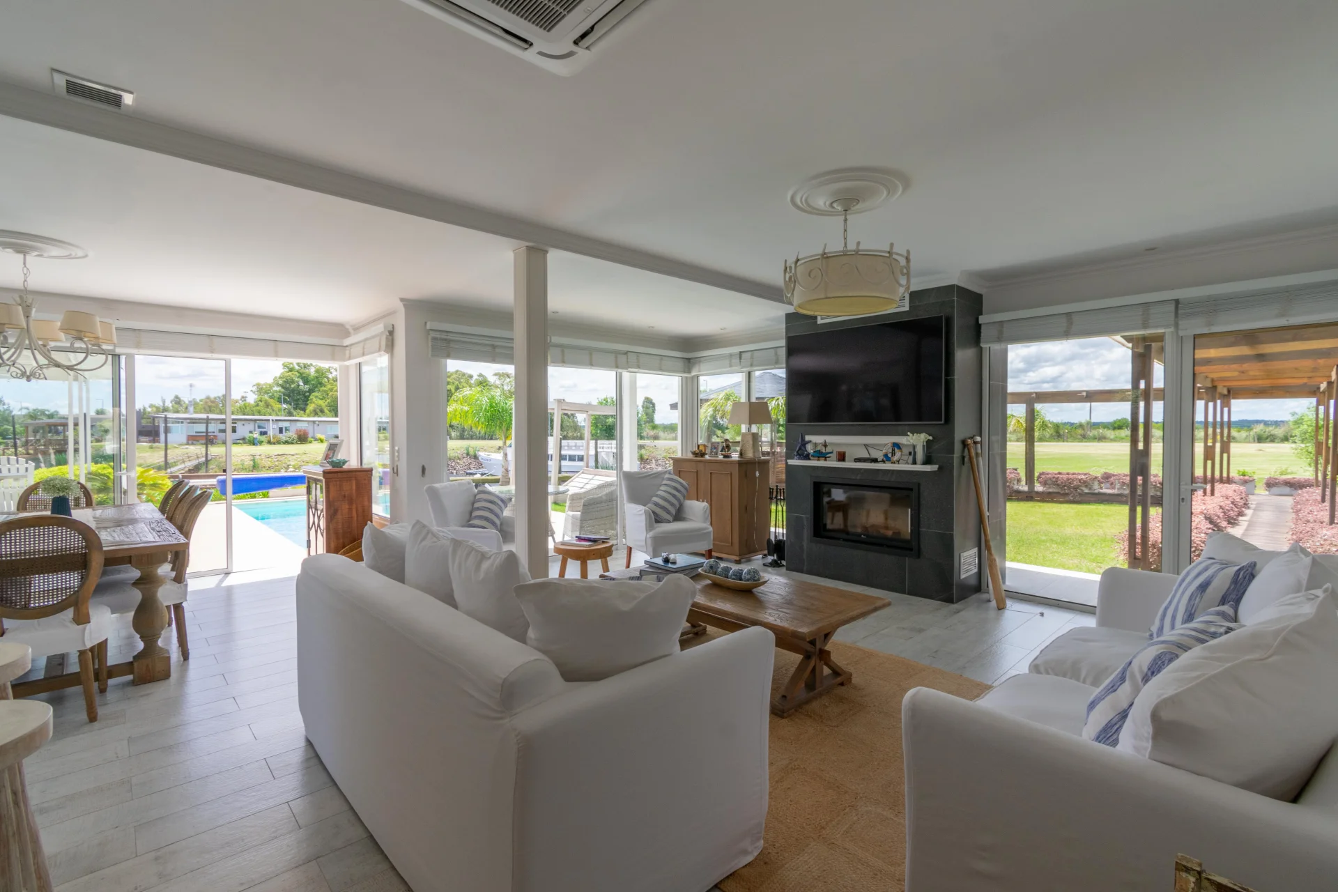 - Living comedor amplio, estufa a leña y ventanales con vista al canal.