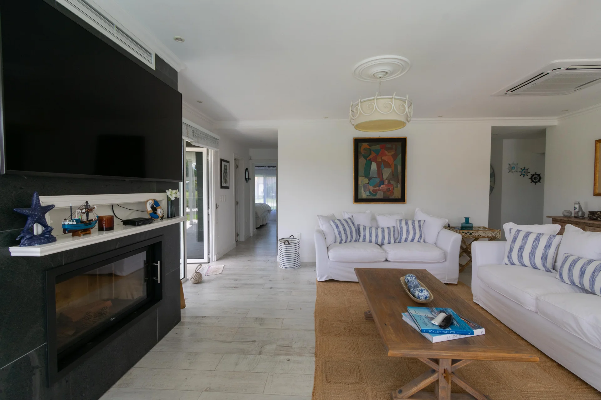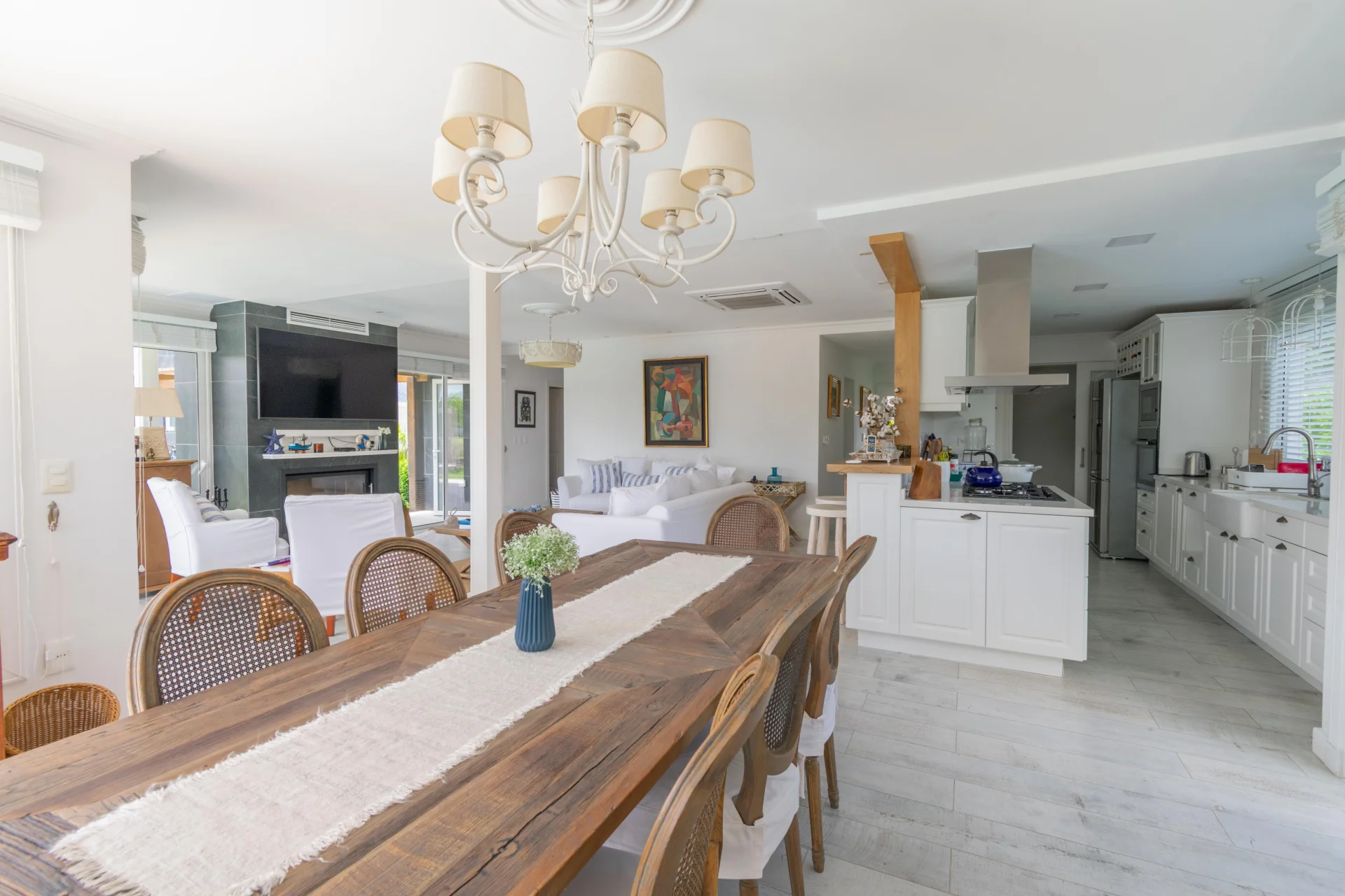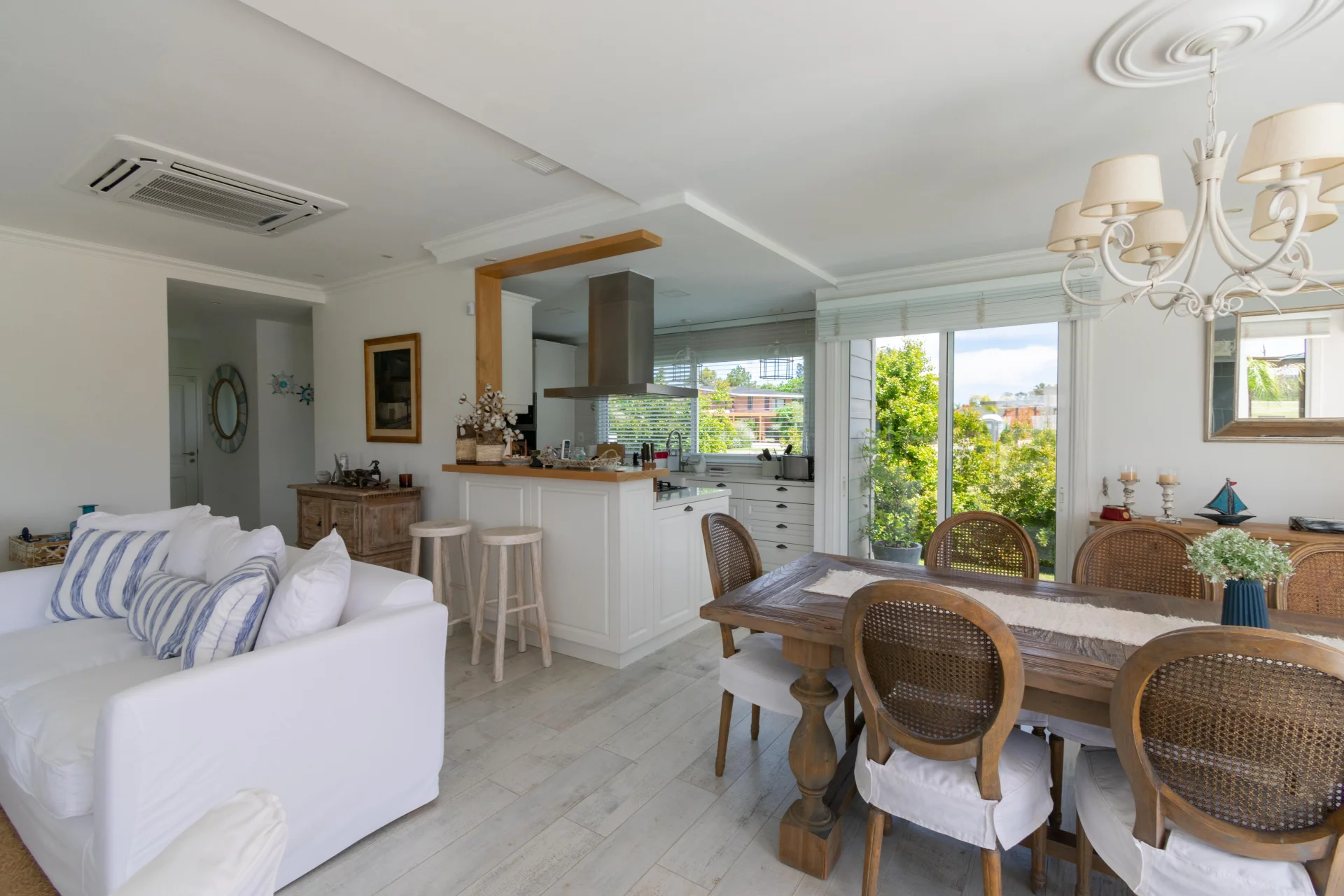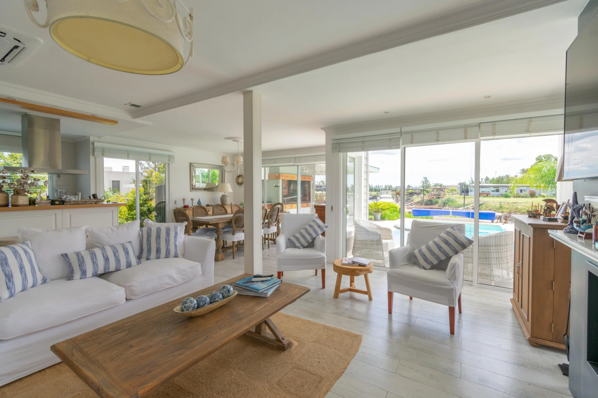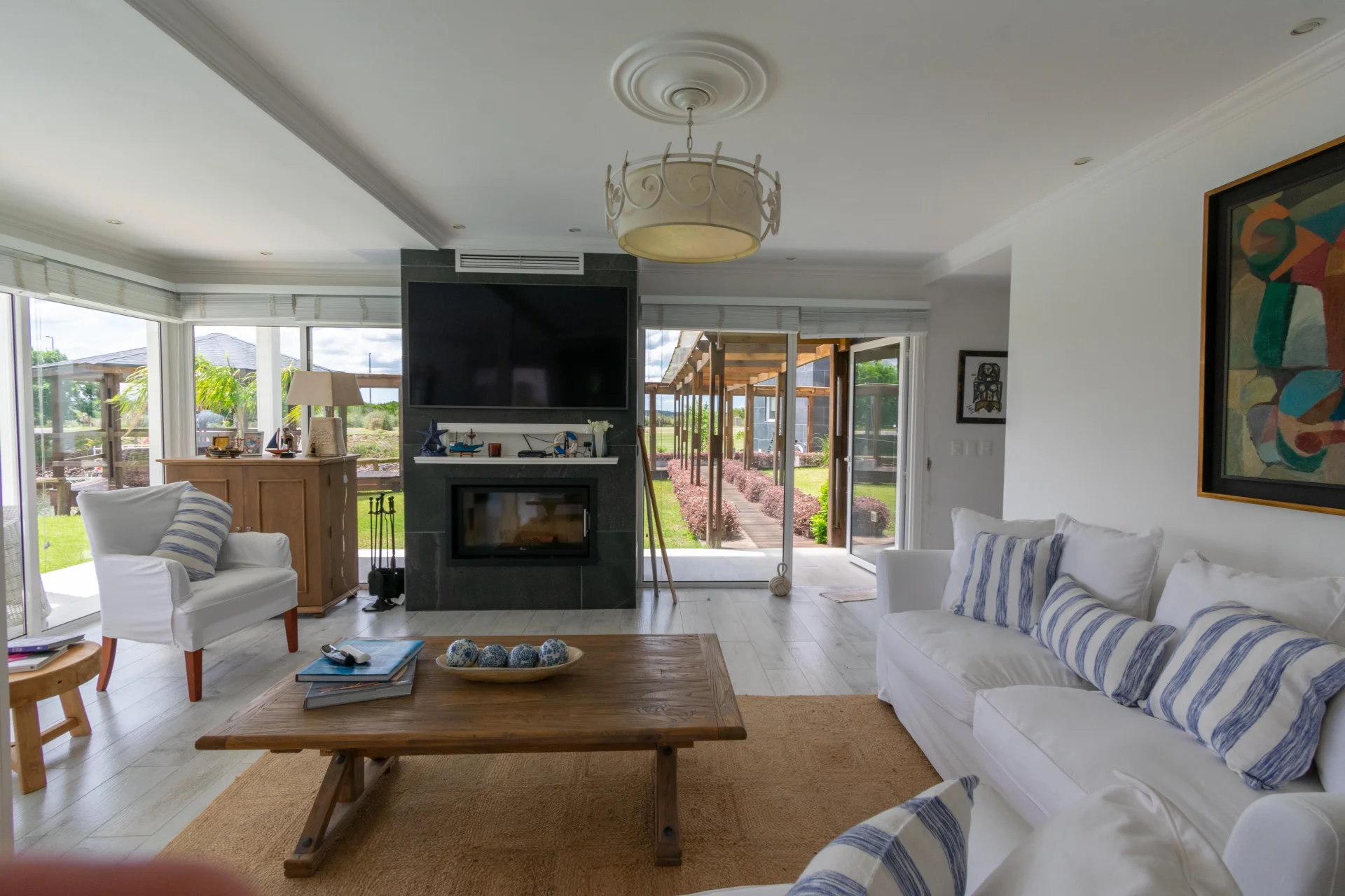 - Living comedor amplio, estufa a leña y ventanales con vista al canal.