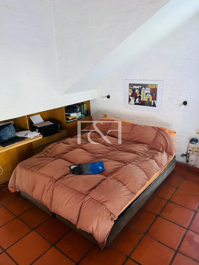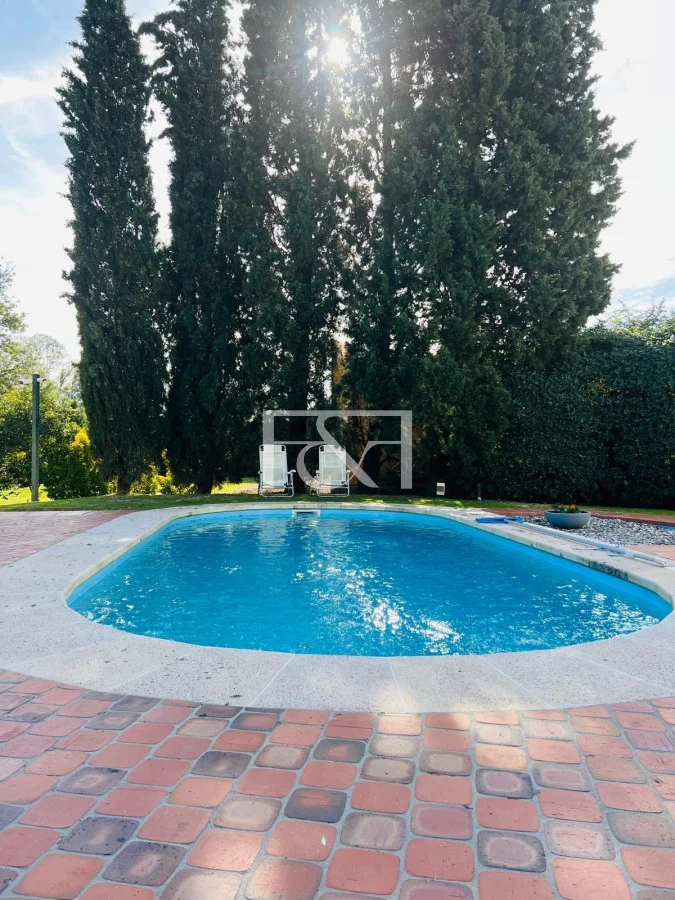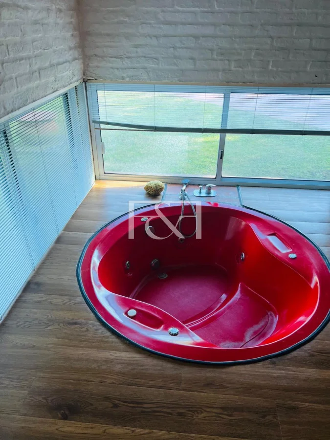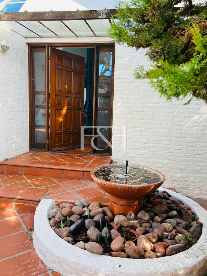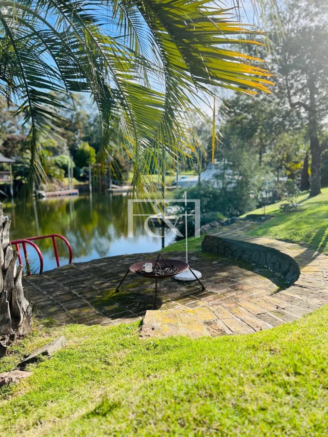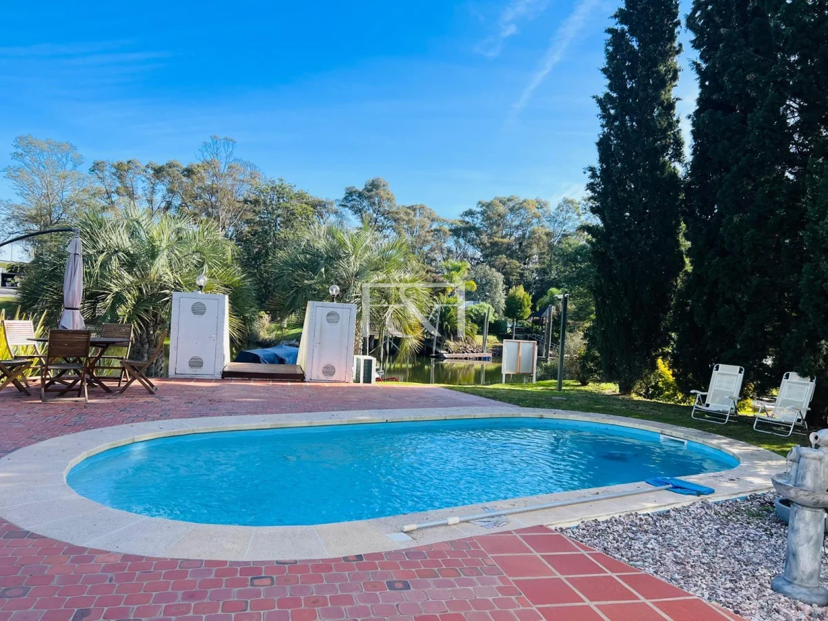 El exterior se destaca por su piscina climatizada, rodeada de un amplio espacio de césped que invita a relajarse, jugar o realizar actividades al aire libre. La entrada se realiza a través de un encantador patio con piso de terracota, una fuente decorativa y un área de descanso que añade un toque de serenidad y belleza al entorno. La casa cuenta con un muelle privado, perfecto para actividades náuticas o paseos en barco, complementando la vida en un entorno acuático.
