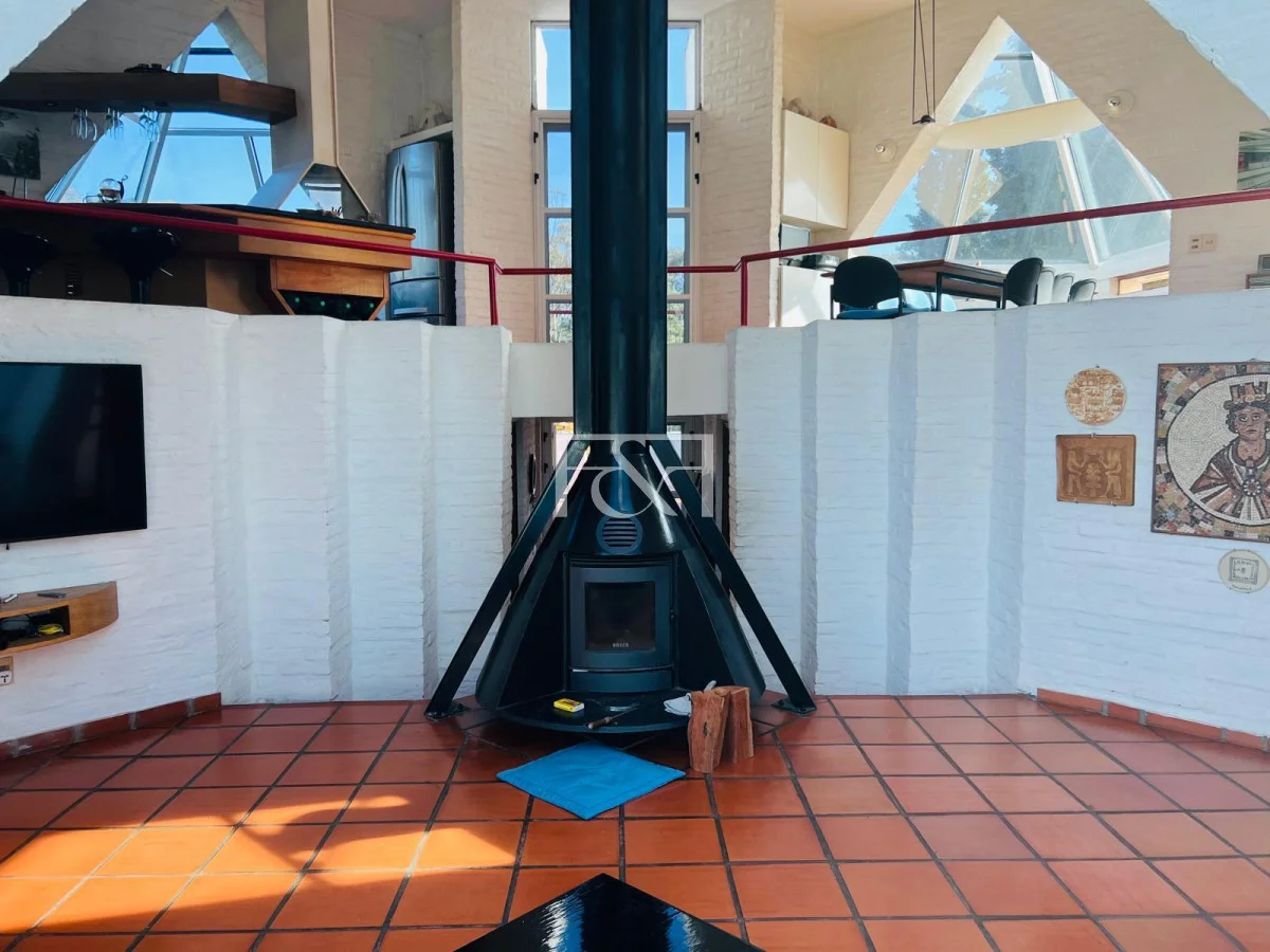 El interior refleja un estilo cálido y contemporáneo, con detalles únicos como una chimenea de leña en la sala de estar, que invita a disfrutar de momentos acogedores en las temporadas más frescas. La sala de estar cuenta con una amplia zona de asientos en tonos azules con estufa a leña .