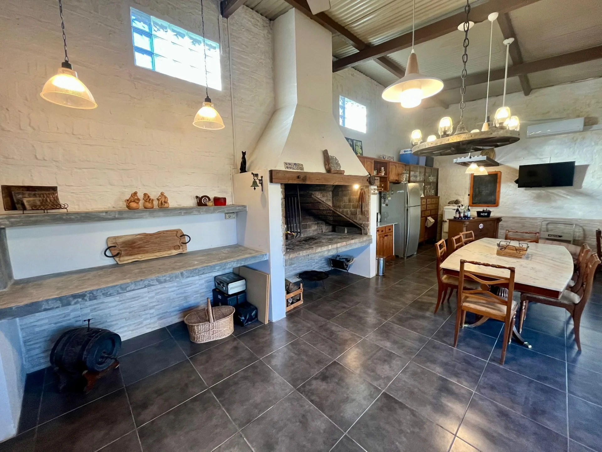 Barbacoa cerrada de gran tamaño con parrillero y ventanales hacia el jardín.